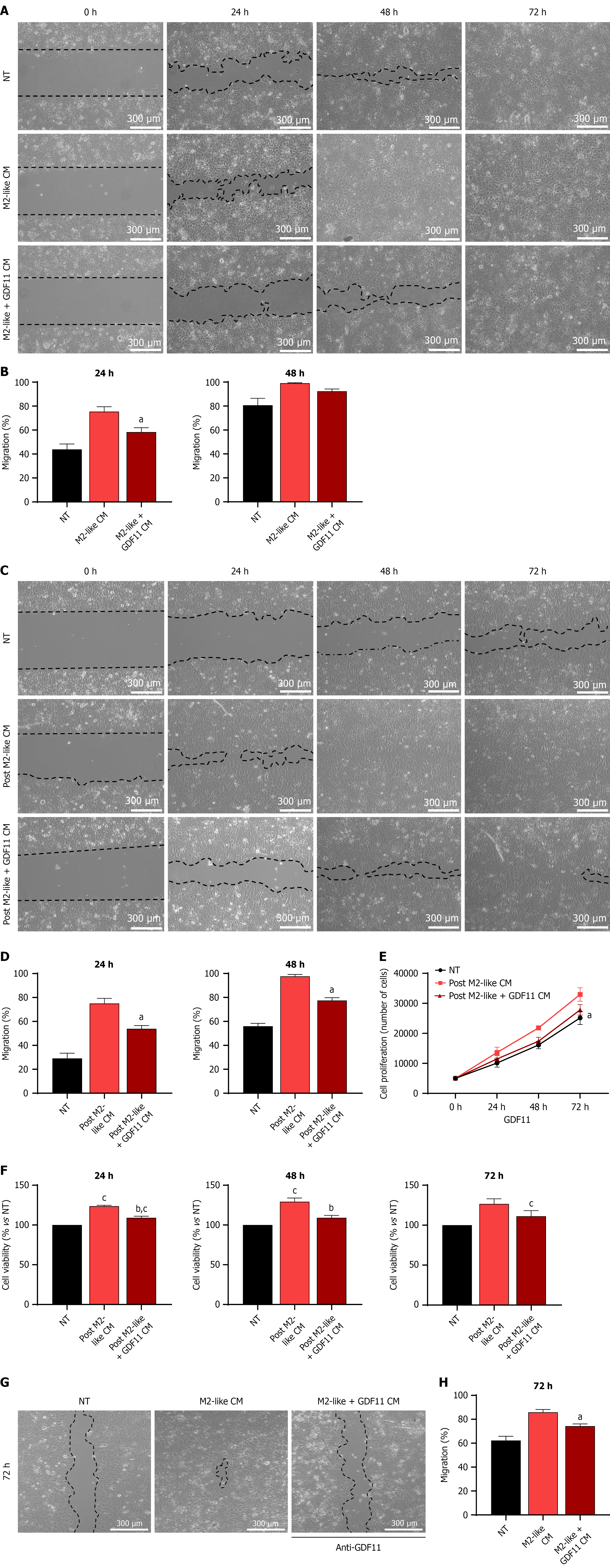 A: Cell migration assay determined by a wound healing assay, representative images of at least three independent experiments. Scale bars: 300 μm (100 ×, original magnification); B: Percentage of migration determined by Image J software; C: Cell migration assay determined by a wound healing assay, representative images of at least three independent experiments. Scale bars: 300 μm (100 ×, original magnification); D: Percentage of migration determined by Image J software; E: Cell proliferation; F: Cell viability at 24 hours, 48 hours, and 72 hours under different treatments; G: Cell migration assay determined by a wound healing assay using anti-GDF11. Scale bars: 300 μm (100 ×, original magnification); H: Percentage of migration determined by Image J software. Each column or point represents the mean ± SEM of at least three independent experiments carried out in triplicate. aP ≤ 0.05 vs M2-like conditioned media or post M2-like conditioned media; bP ≤ 0.05 vs post M2-like conditioned media; cP ≤ 0.05 vs not treated cells. Each column or point represents the mean ± SEM of at least three independent experiments carried out in triplicate. Anti-growth differentiation factor 11 was used to inhibit the remnants of the recombinant growth differentiation factor 11. NT: Not treated cells; CM: Conditioned media; GDF11: Growth differentiation factor 11.