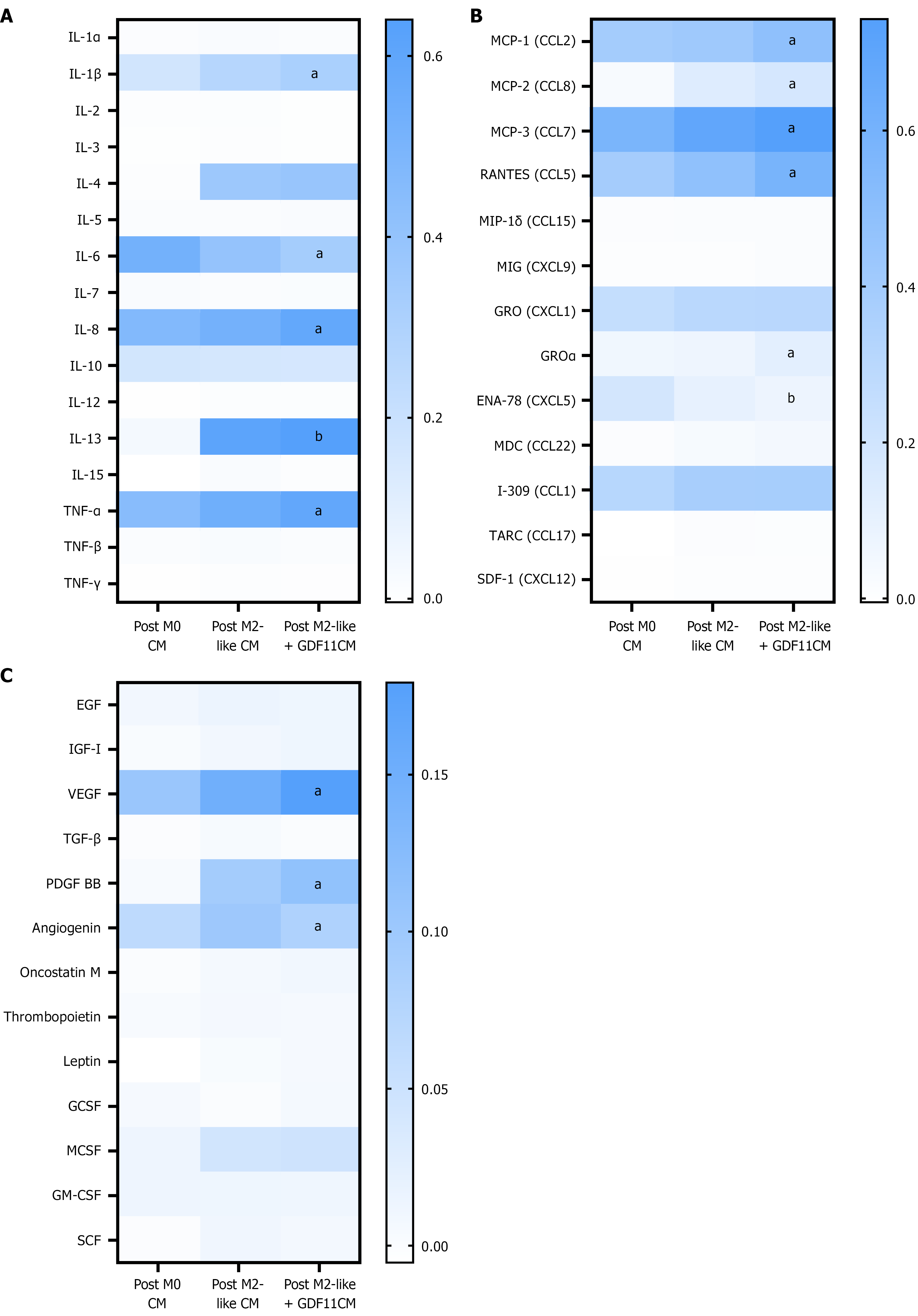 A: Interleukin and interferon family alteration by growth differentiation factor 11 (GDF11) on post M2-like macrophages, aP < 0.0001 vs post M2-like conditioned media (CM), bP = 0.0012 vs post M2-like CM; B: Chemokine family alteration by GDF11 on post M2-like macrophages, aP < 0.0001 vs post M2-like CM, bP = 0.0050 vs post M2-like CM; C: Growth factors alteration by GDF11 on post M2-like macrophages, aP ≤ 0.0001 vs post M2-like CM. The mean pixel density in each column on the heat map represents the mean ± SEM of at least three independent experiments. CM: Conditioned media; GDF11: Growth differentiation factor 11.