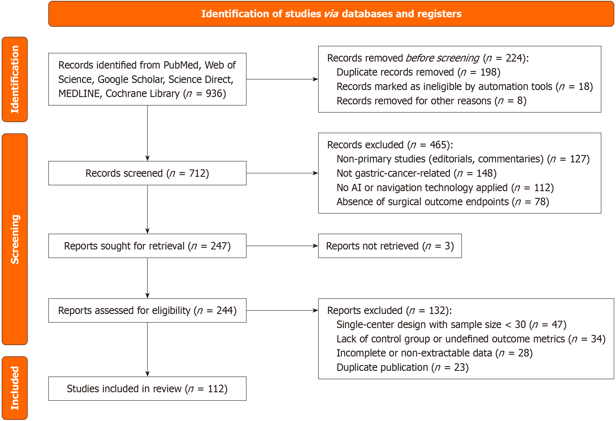 In accordance with the PRISMA 2020 guidelines, a systematic search was conducted in PubMed, Embase, Web of Science, CNKI, ClinicalTrials.gov, and ScienceDirect for relevant literature published up to May 2025. The search terms included “artificial intelligence”, “real-time imaging navigation”, “radical gastrectomy”, “gastric cancer”, “intraoperative guidance”, and “surgical outcomes”. No restrictions were applied regarding language or publication type. Original studies evaluating the clinical application of AI or navigation technologies in radical gastrectomy for gastric cancer were included, whereas editorials, letters, and non-clinical studies were excluded. The study selection process is presented in Figure 1.