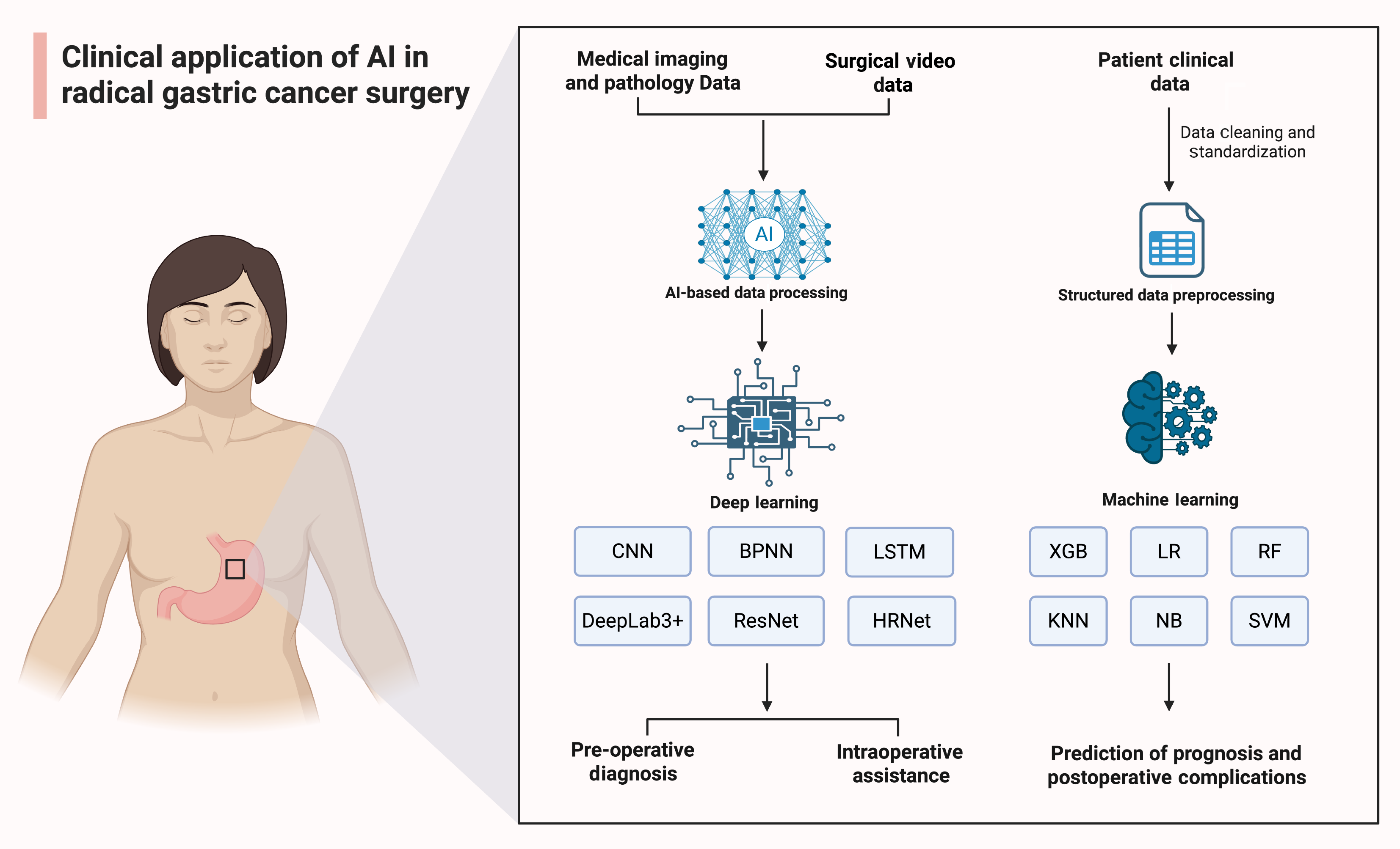 The integration of AI and radiomics has markedly improved the preoperative diagnostic accuracy of gastrectomy. Deep learning enhances recognition of surgical steps, vascular structures, and adjacent organs, while machine learning supports postoperative outcome monitoring, survival prediction, and complication prevention. Real-time navigation, multimodal imaging fusion, AR, and fluorescence imaging strengthen intraoperative precision and safety. Clinical adoption should follow the principle of “empowerment rather than replacement”, fostering human-machine collaboration to combine clinical expertise with AI capabilities.