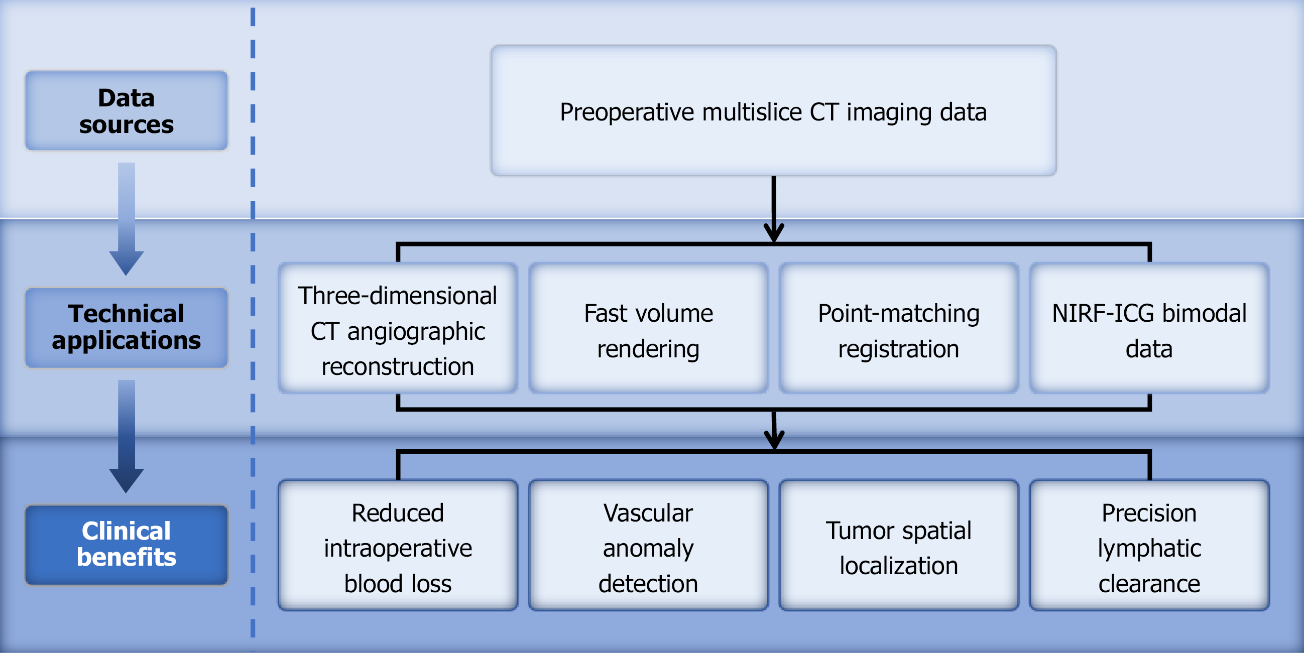 Application value of 3D CT vascular reconstruction combined with real-time imaging navigation technology in laparoscopic radical gastrectomy: Although traditional laparoscopic radical gastrectomy has become the standard procedure, it still faces challenges such as vascular variations and difficulties in lymph node localization, especially in complex abdominal anatomical structures. These issues may lead to prolonged surgery time, increased blood loss, and higher postoperative complication risks. Jung et al[51] evaluated the clinical value of the RUS-GA navigation system in laparoscopic radical gastrectomy. During surgery, the system used an additional monitor to merge reconstructed vascular anatomy with real-time laparoscopic images, providing intuitive intraoperative navigation. The study included 38 patients in the navigation group and 114 in the non-navigation group, with propensity score matching applied to reduce bias. The results showed that the navigation group had a significantly lower overall complication rate (10.5% vs 26.3%, P = 0.043) and a lower incidence of Clavien-Dindo grade ≥ 2 complications (7.9% vs 24.6%, P = 0.027). No pancreas-related complications occurred in the navigation group, compared with 7.0% in the non-navigation group (P = 0.093).