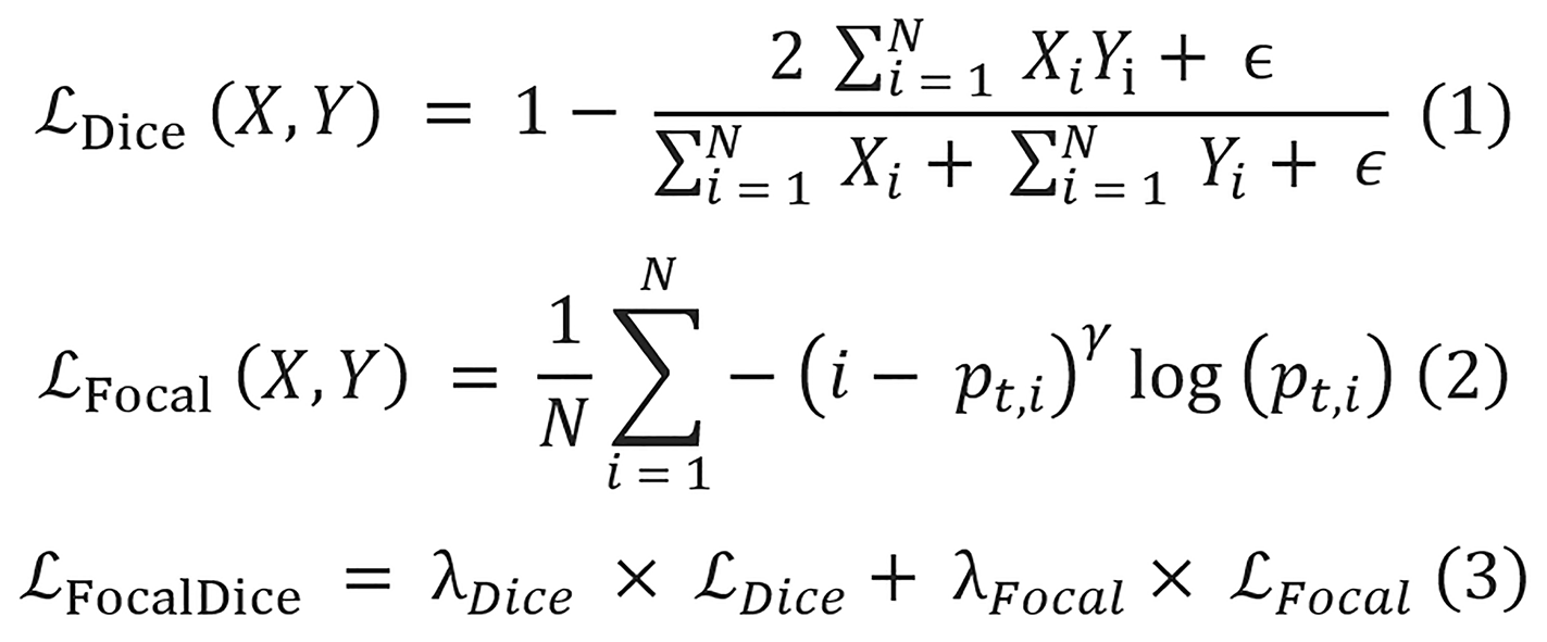 Where X is the predicted mask, Y is the ground truth label, N denotes the total number of pixels, and ϵ is a very small constant with a value of 1 × 10-5 added to avoid division by zero. pt,i is the predicted probability for the true class label of the pixel i, and the value for γ is 2. The values for both λDice and λFocal are equal to 1.
