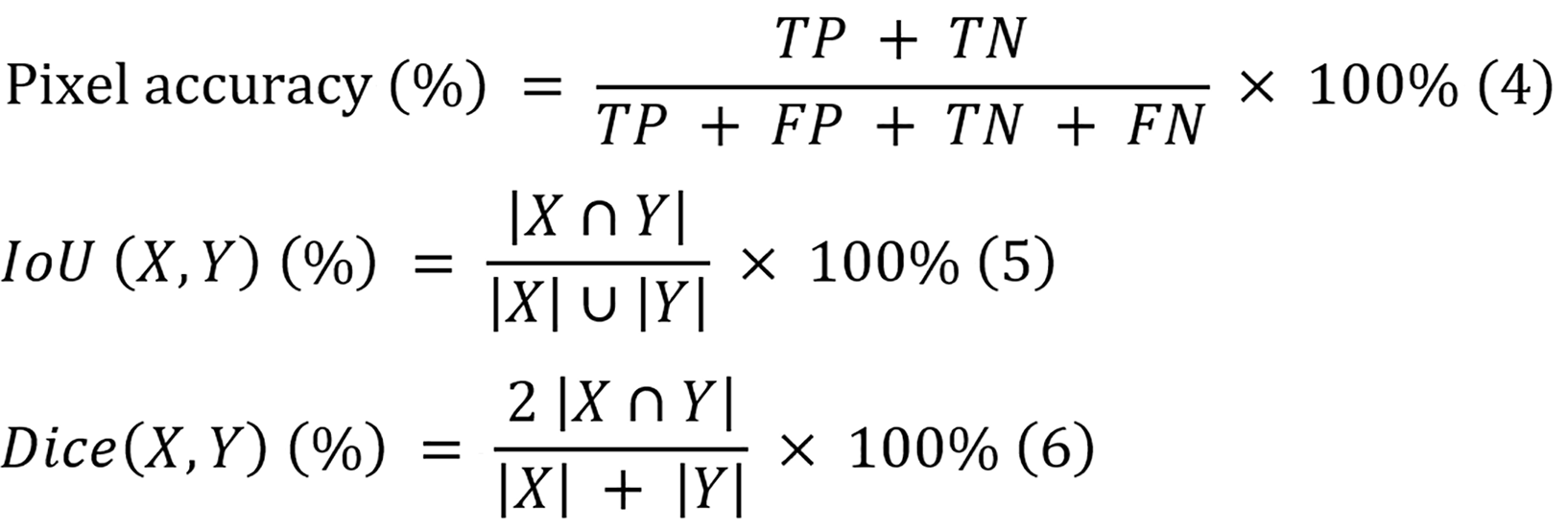 Where TP, TN, FP, and FN denote the numbers of true-positive pixels, true-negative pixels, false-positive pixels, and false-negative pixels, respectively, and X and Y represent the predicted mask and ground truth label, respectively.