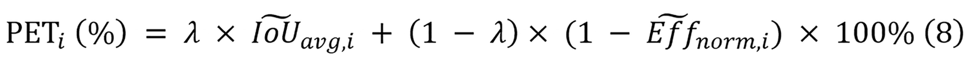 Where (IoU), (avg, i) and (Eff) (norm, i) represent the normalized average IoU and normalized efficiency of model i. When calculating the PET score, these normalized values ensure fair comparisons between models that exhibit different scales of IoU, parameter count, computational complexity, and inference time. For this study, the parameter λ equals 0.5, reflecting the equal significance of both segmentation performance and efficiency in diagnostic applications.