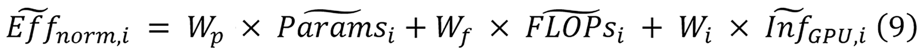 Equation 9 calculates the normalized efficiency as a weighted sum combining three components for model i: Normalized parameter counts (Paramsi), normalized FLOPs (FLOPsi), and normalized inference time (InfGPU, i). Equal importance is assigned to each efficiency component through weighting factors Wp, Wf, and Wi, with each set to 1/3. The normalization equations for all four metrics are displayed in equation 10.