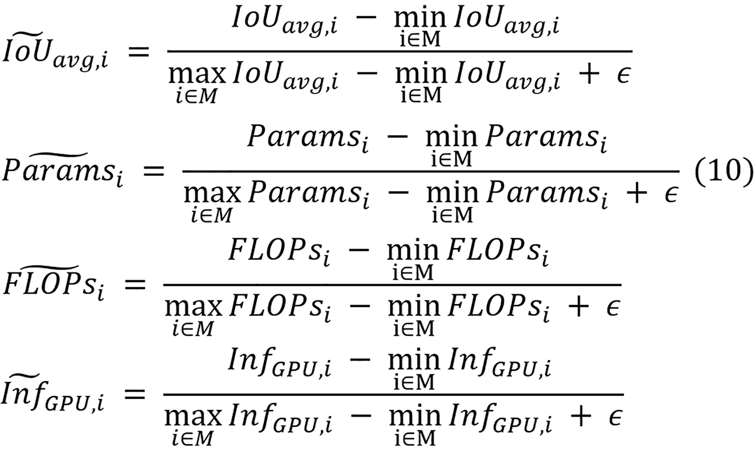 Where IoUavg,i, Paramsi, FLOPsi, and InfGPU,i denote the raw average IoU, parameter count, FLOPs, and inference time of model i, respectively. Across all models in set M, the minimum and maximum average IoU values are represented by min (i∈M), (IoUavg,i) and max (i∈M), (IoUavg,i), with similar notation used for the ranges of parameters, FLOPs, and inference time. An addition of a small constant ϵ of 0.001 is applied to prevent the potential division by zero in the de