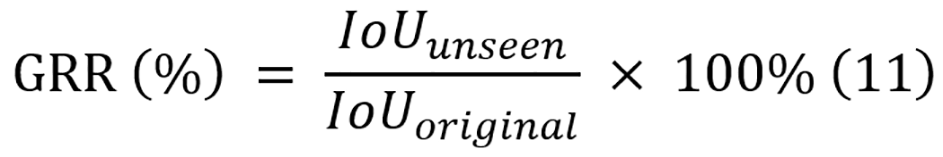 To quantify the generalization, the generalization retention rate (GRR) is introduced. GRR represents the ratio of binary IoU on the unseen dataset to the original IoU on the test split of the training dataset, and its equation is displayed in equation 11. These metrics provide quantitative measures of how well the performance of each model can be transferred to unseen data conditions, with higher values indicating better generalization.
