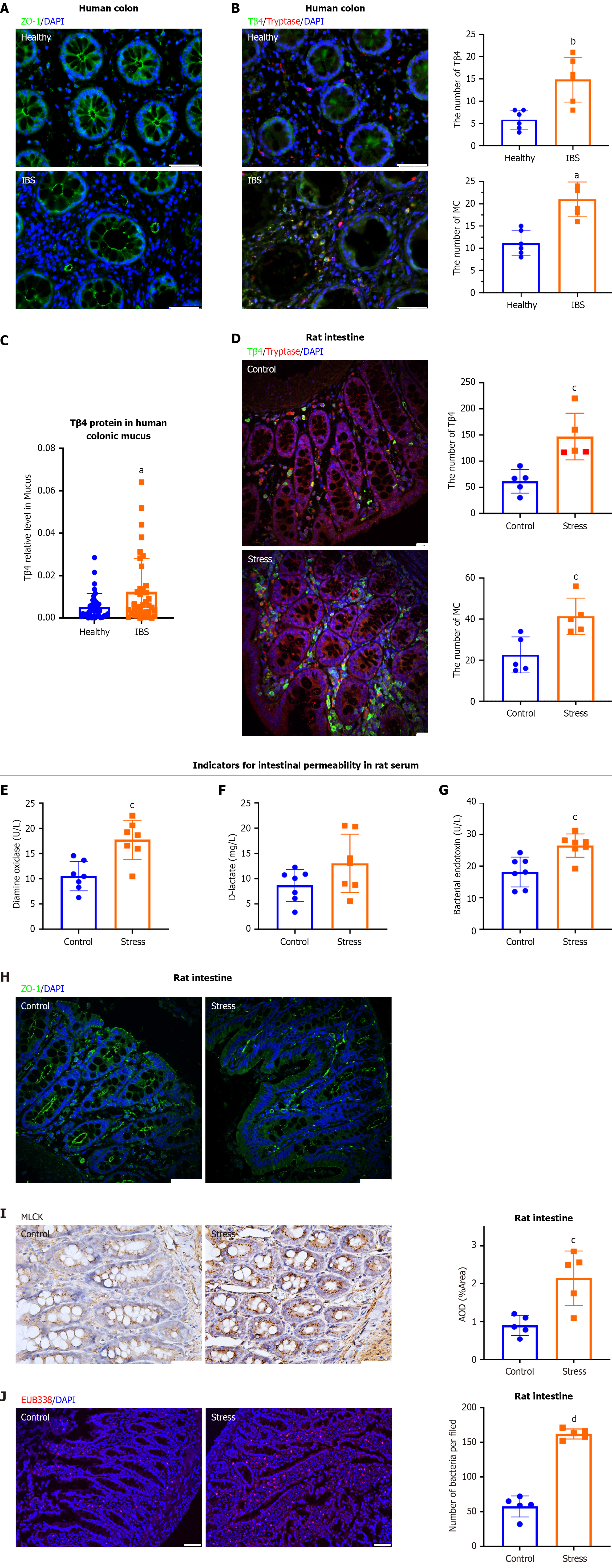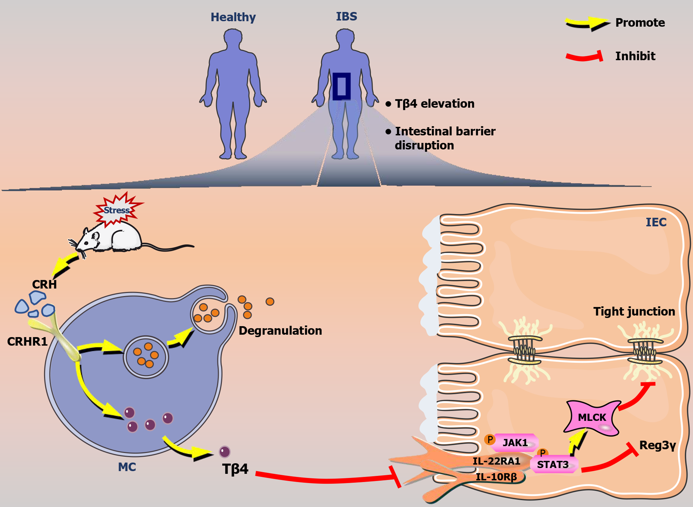 Core Tip: Thymosin β4 (Tβ4) is identified as a prevalent component in the intestinal mucus of irritable bowel syndrome patients that is capable of independently causing intestinal barrier disruption, even without the involvement of mast cells, when triggered by either corticotropin-releasing hormone (CRH) or stress. In addition, mast cells are the source of the Tβ4 required for intestinal barrier damage, and its release is contingent on CRH/CRH receptor 1 but not on degranulation. Mechanistically, the impact of Tβ4 on both the physical and immune barriers is mediated through the inhibition of Janus kinase 1/signal transducer and activation of transcription 3 signaling. These findings position Tβ4 as a promising diagnostic biomarker and therapeutic target for irritable bowel syndrome.