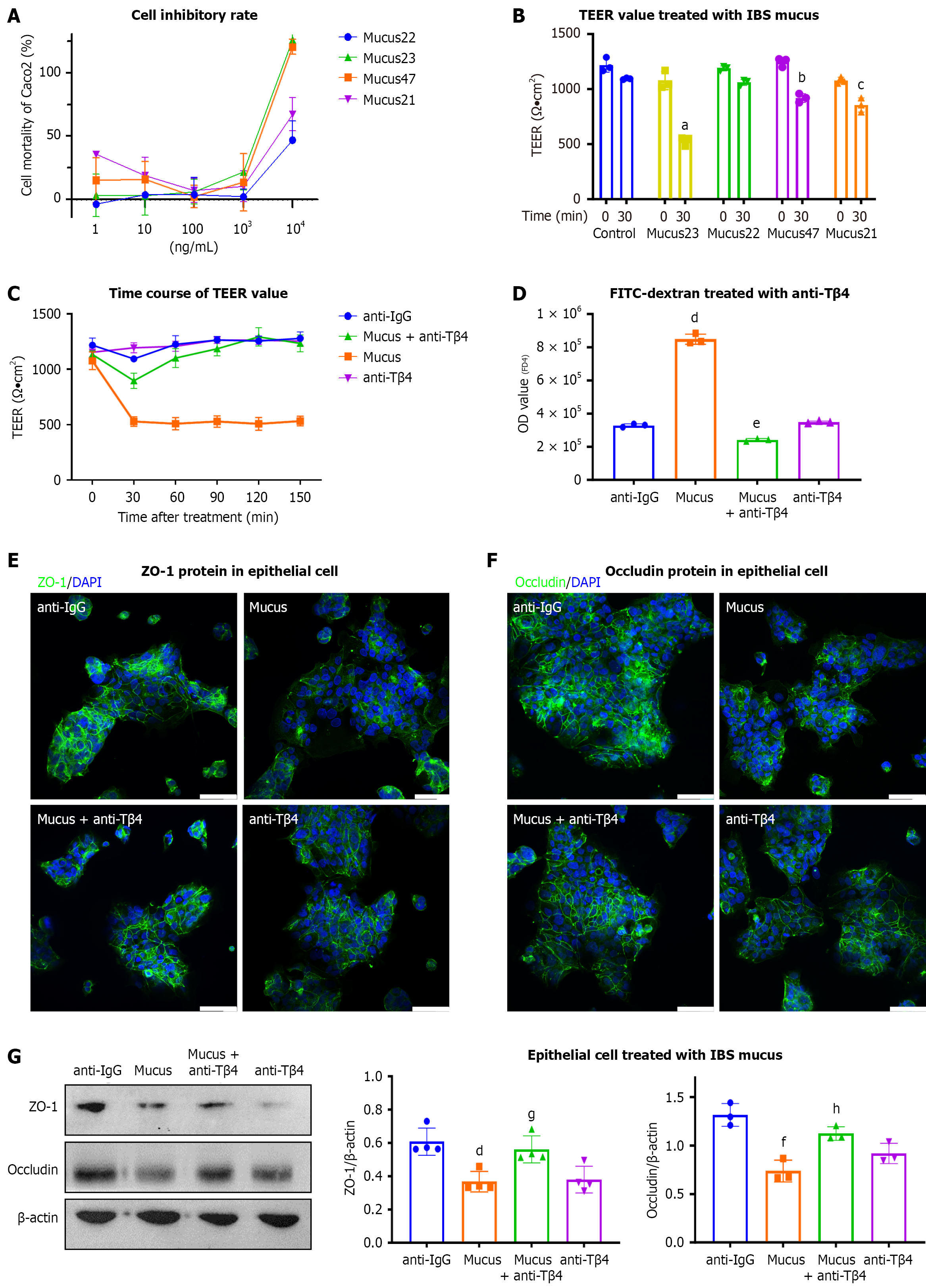 The colonic mucus Tβ4 levels in IBS patients were determined and their effects on the epithelial barrier were assessed in vitro and in vivo. Specifically, rats gene