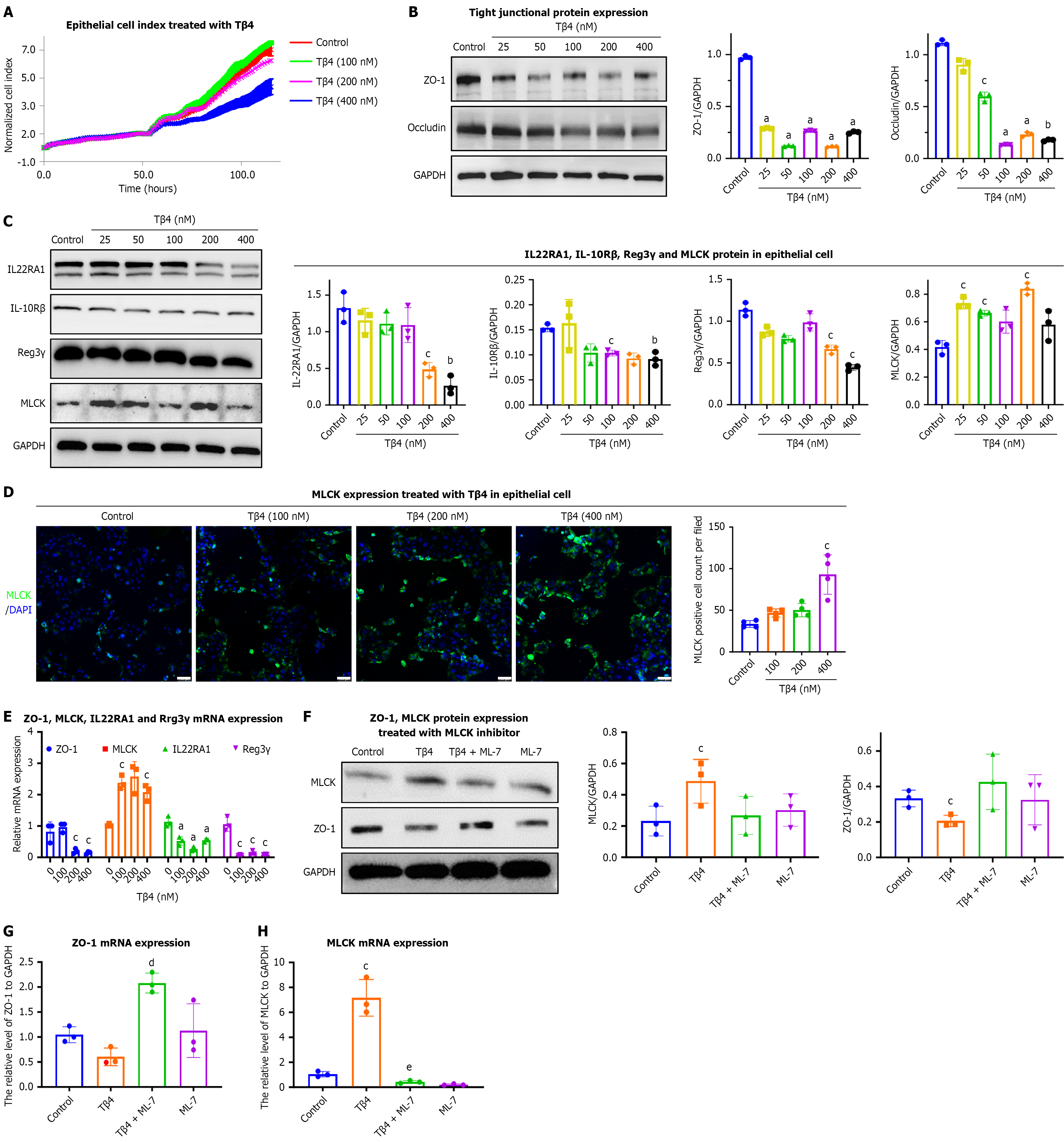Beyond their role in maintaining the physical barrier, epithelial cells also contribute to the immune barrier through the production of immune factors and effectors. IL22, which binds to IL22R (comprising IL22RA1 and IL-10Rβ) on IECs, prompts the production of antimicrobial peptides (e.g., Reg3γ) and mucin, aiding in the segregation of microorganisms from the intestinal mucosa[40,41]. Our results demonstrated that Tβ4 upregulates MLCK expression while decreasing the protein and mRNA levels of IL22RA1 and Reg3γ in Caco2 cells (Figure 3C-E). This suggests a complex effect of Tβ4 on the integrity and functionality of epithelial barriers. Notably, pre-treatment with ML-7, an MLCK inhibitor, alleviated the decrease in ZO-1 Levels induced by Tβ4 (Figure 3F-H).