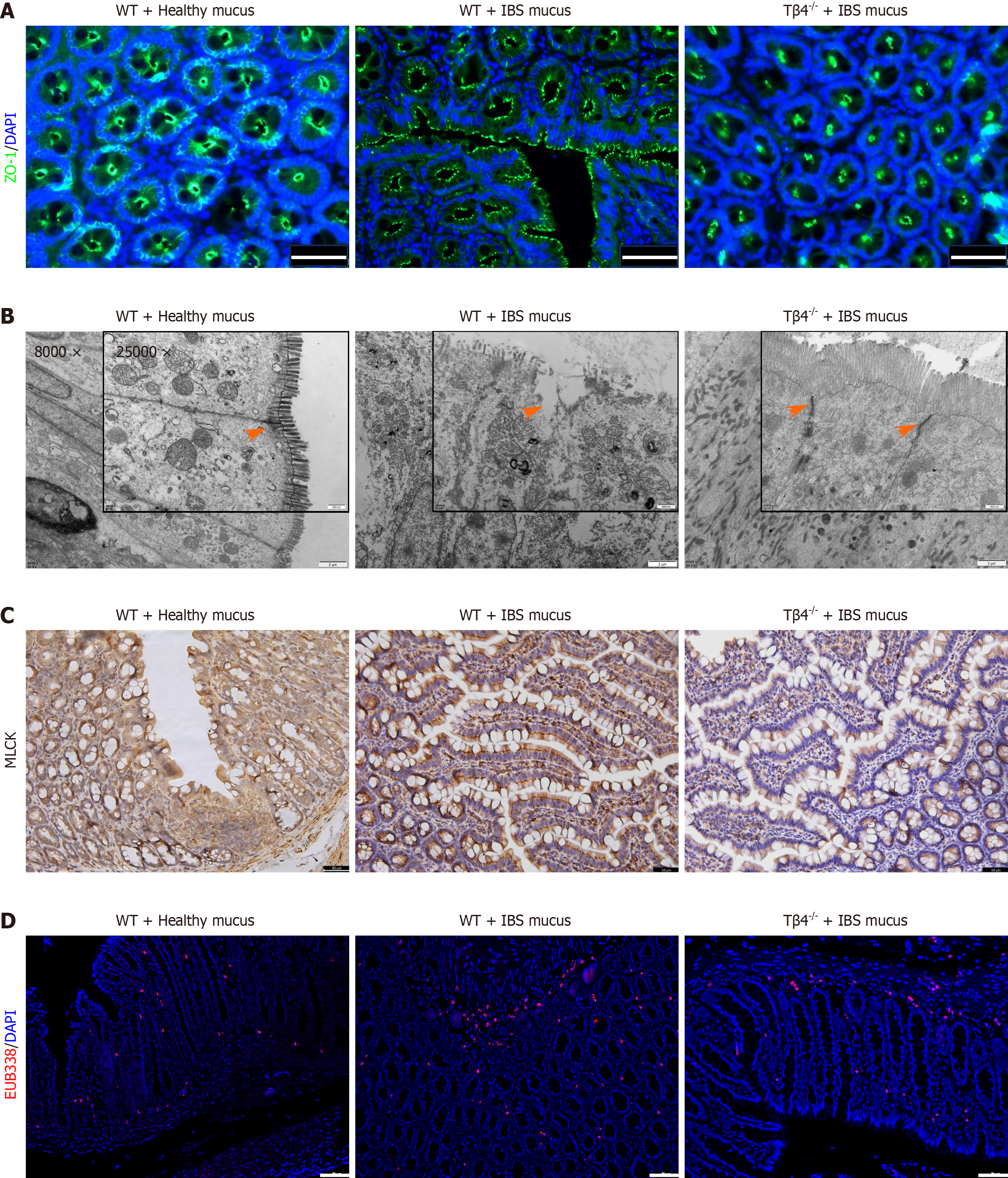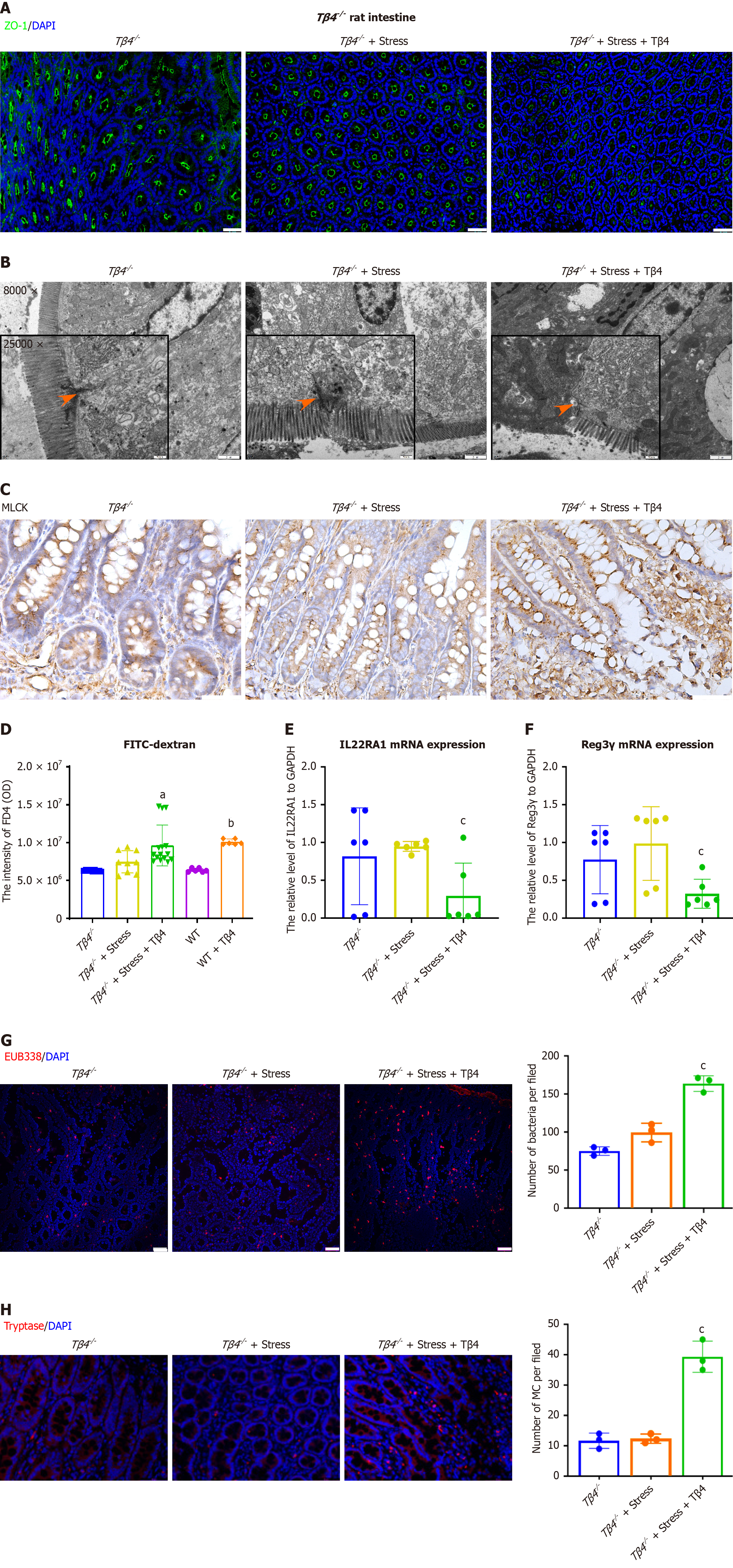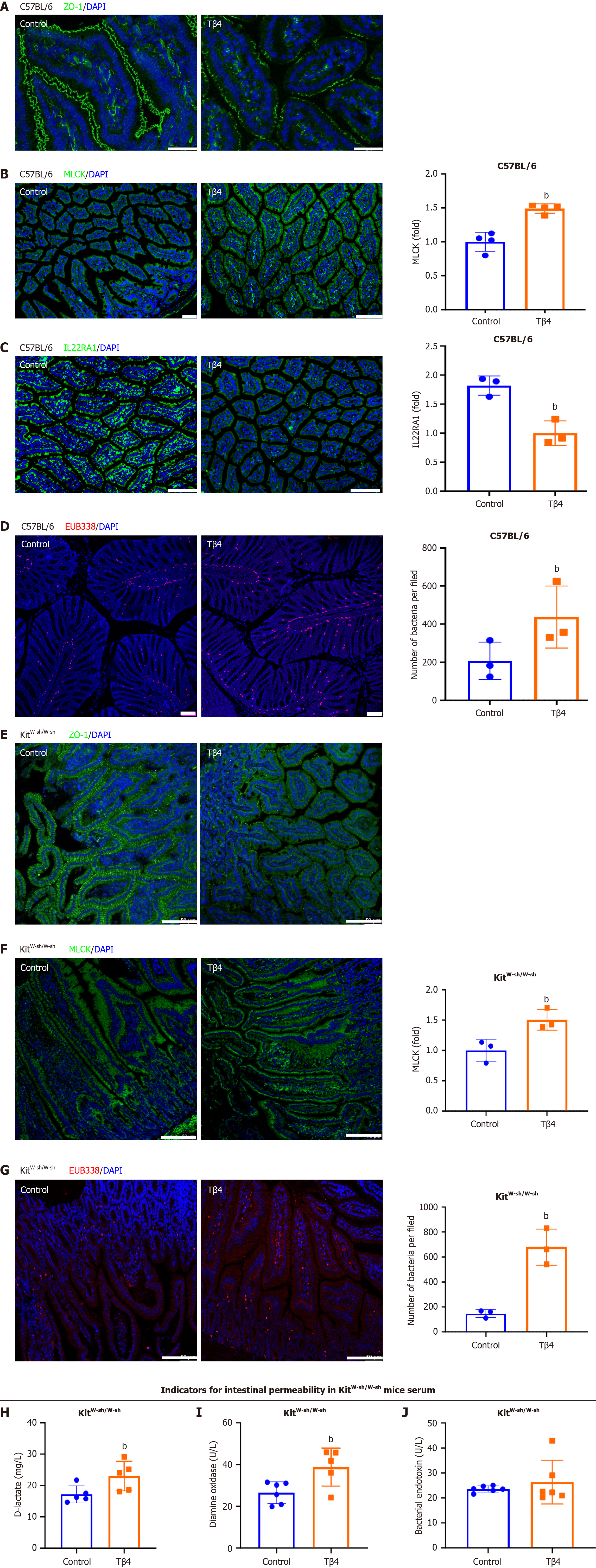 Given the established role of Tβ4 in activating MCs[42,43], which are key players in disrupting the intestinal barrier, we further investigated whether the barrier dysfunction induced by Tβ4 was MC-dependent. To this end, we treated MC-deficient mice (KitW-sh/W-sh) with Tβ4. The results demonstrated that Tβ4 also induced intestinal permeability and dysbiosis in KitW-sh/W-sh mice (Figure 4E-J), as evidenced by disrupted TJ, activated-MLCK, and enhanced EUB338. These results suggest that the impact of Tβ4 on the intestinal barrier occurs independently of MC-mediated mechanisms.