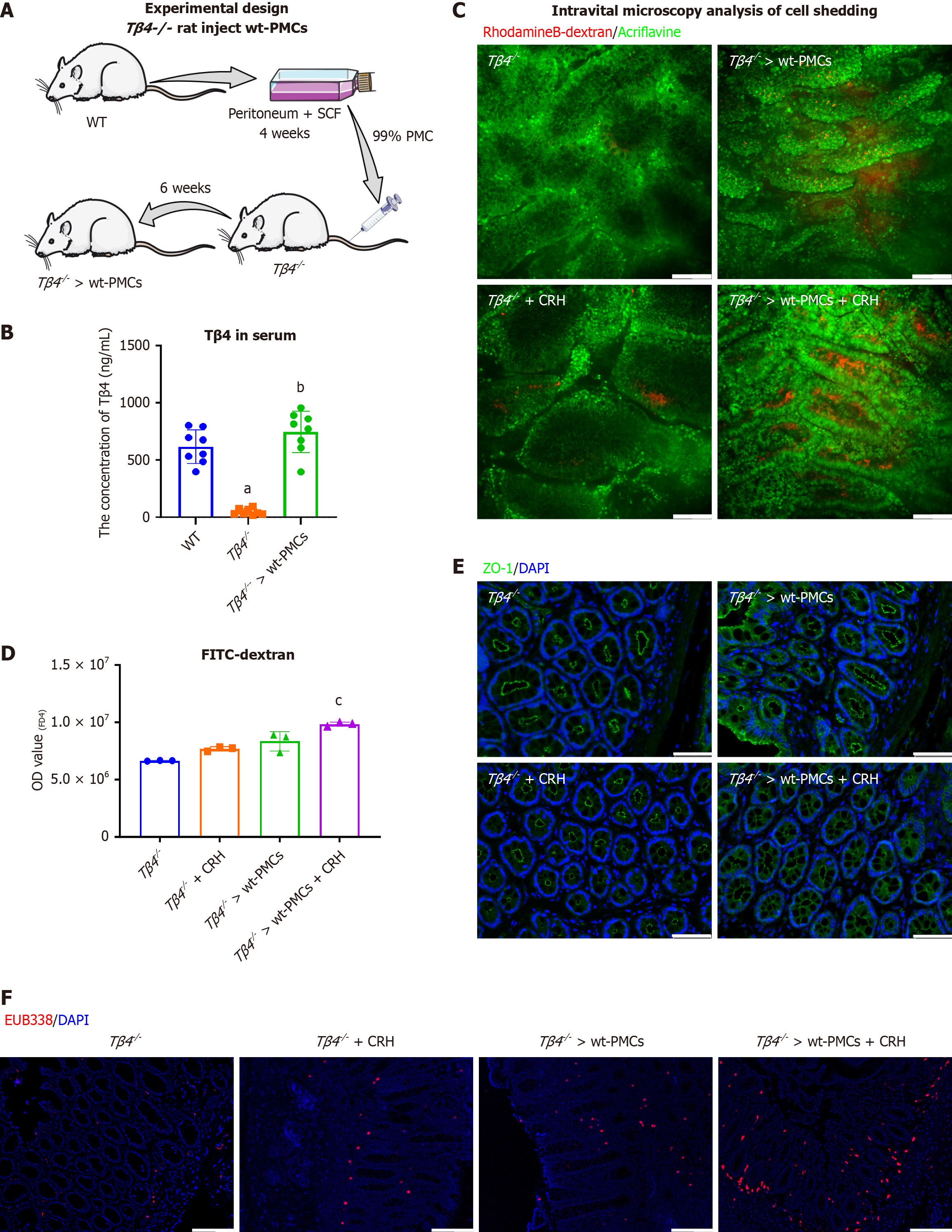 Next, we evaluated whether the reconstituted rats exhibit similar responses to stimulation with CRH, which is known to increase intestinal permeability in an MC-dependent manner[44]. Intravital microscopy demonstrated that the colons of CRH-treated rats had increased cell shedding, indicative of epithelial leakage, and that the level of shedding was even greater for “Tβ4-/- > wt-PMCs” rats (Figure 7C). Further evidence of increased barrier permeability in “Tβ4-/- > wt-PMCs” rats was demonstrated by increased serum FD4 (Figure 7D), disruption of TJ (Figure 7E) and significant infiltration of submucosal bacteria (Figure 7F). Overall, these results suggest that the Tβ4 released by activated MC is a key factor to mediate intestinal barrier impairment.