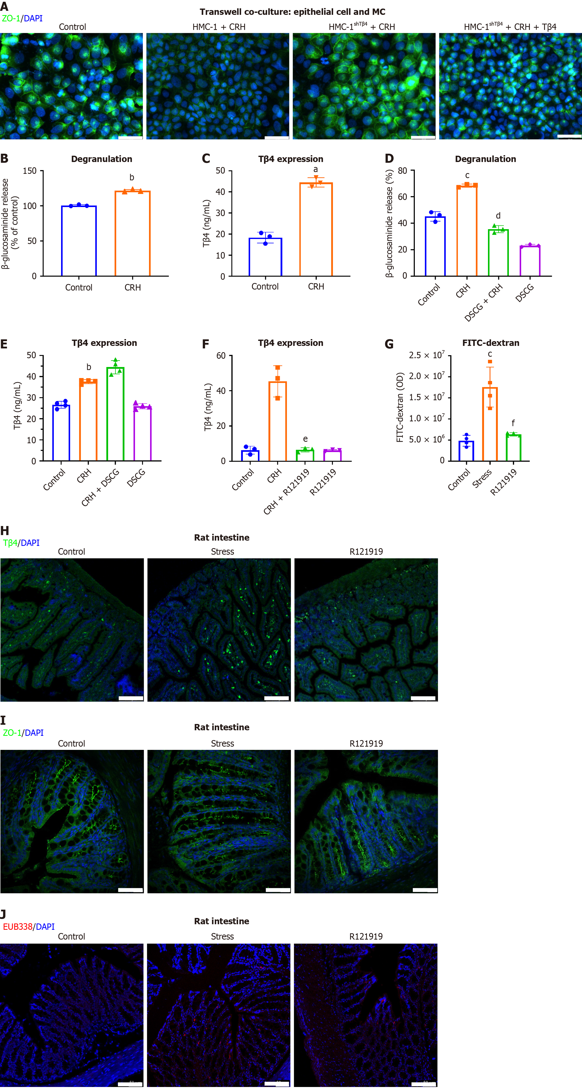 Nevertheless, Tβ4 release was inhibited by R121919, a CRH receptor 1 (CRHR1) antagonist, pointing to CRH signaling as a specific mechanism for Tβ4 release (Figure 8F). Given the prior application of CRHR1 antagonist in mitigating the hallmark IBS symptom of visceral hypersensitivity[45], we explored its therapeutic efficacy in the stress-induced IBS model. Intraperitoneal administration of R121919 over three days blocked FD4 infiltration into peripheral blood (Figure 8G). Moreover, R121919 treatment promoted a decrease in Tβ4 Levels within the intestinal mucosa (Figure 8H) and the normalization of TJs (Figure 8I). Additionally, R121919 blocked stress-induced submucosal bacterial infiltration (Figure 8J). These findings suggest that targeting the CRH/CRHR1 signaling pathway reduces the release of Tβ4 in MCs and offers protective benefits in the stress-induced IBS model.