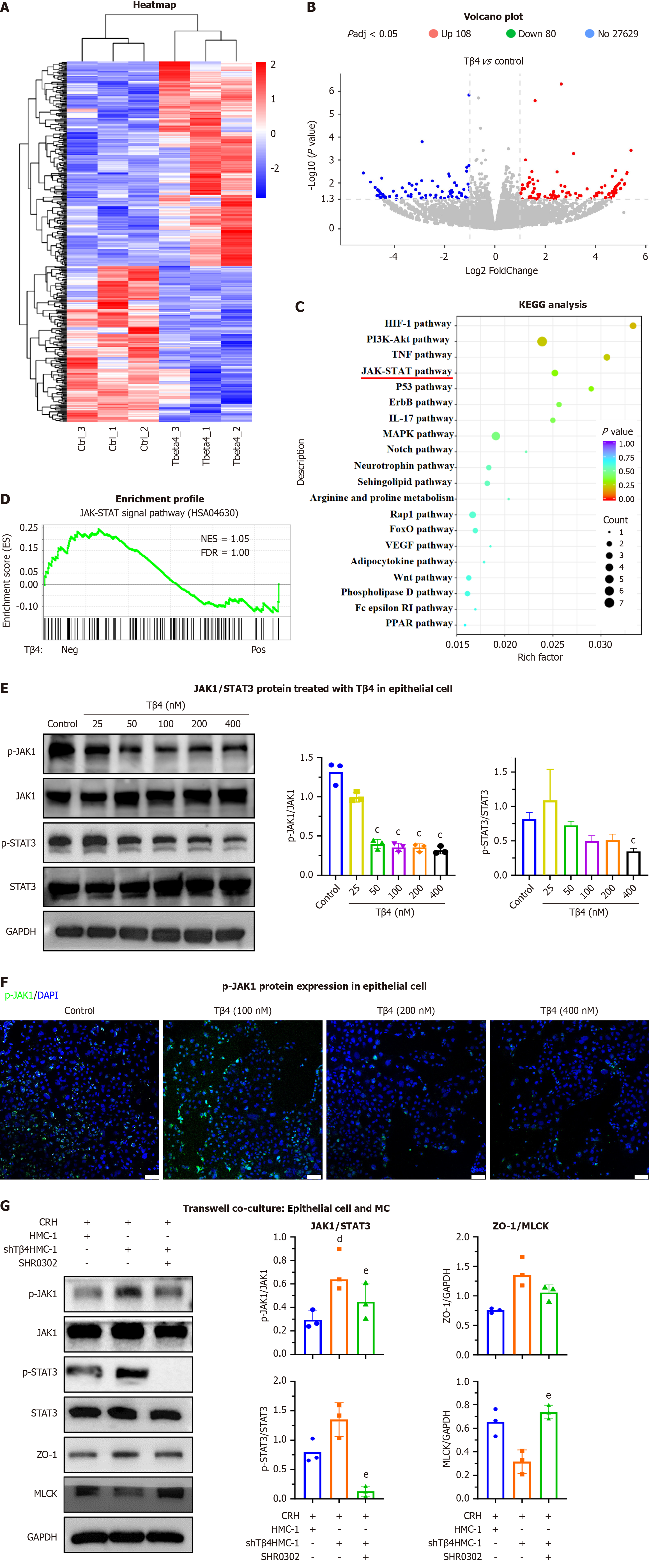 To identify the molecular mechanism by which Tβ4 damages the epithelial barrier, we analyzed the effects of Tβ4 on the transcriptome of Caco2 cells by RNA sequencing. A total of 243 genes were up-regulated and 186 were down-regulated after Tβ4 treatment (Figure 9A and B). KEGG analysis demonstrated enrichment in many biologically important signaling pathways, including the HIF-1, PI3K/Akt, TNF and JAK/STAT signaling pathways (Figure 9C). Furthermore, the negative effect of Tβ4 on the JAK/STAT pathway was verified by gene set enrichment analysis (GSEA, Figure 9D), western blotting (Figure 9E) and IF assay (Figure 9E and F). Co-culture of CRH-activated HMC-1shTβ4, as compared to wild-type HMC-1 cells, promoted the phosphorylation of JAK1/STAT3 and the expression of ZO-1 in Caco2 cells, while reducing the expression of MLCK, ZO-1, and these effects were reversed by JAK1/STAT3 inhibitor (SHR0302) (Figure 9G). These results indicate that Tβ4 affects MLCK/ZO-1 by inhibiting the JAK1/STAT3 signaling pathway.