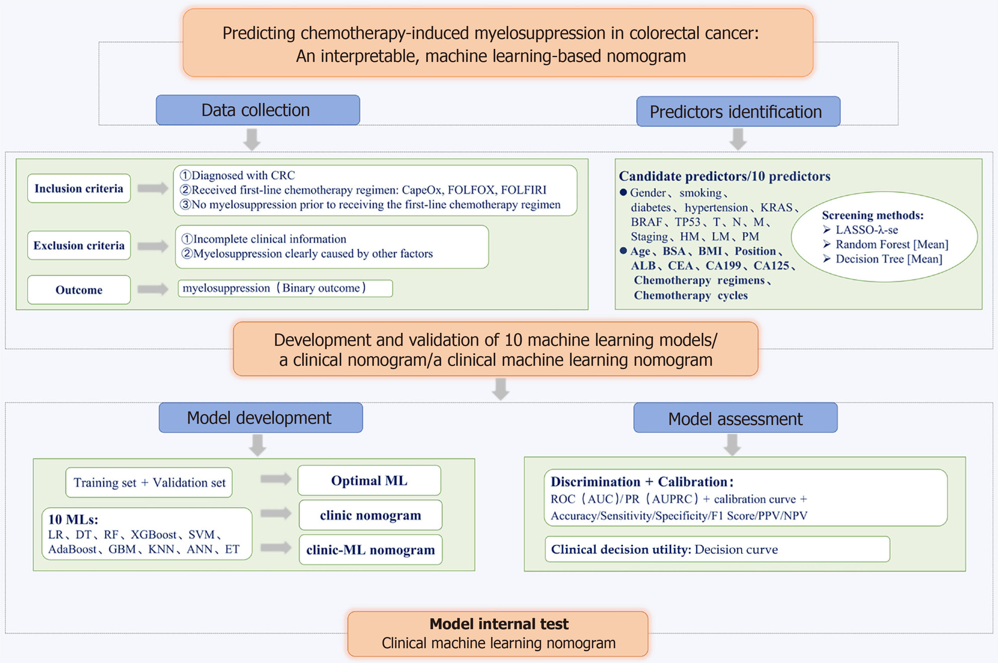 In recent years, the advent of targeted agents and immunotherapies, such as bevacizumab and pembrolizumab, has notably improved both the five-year survival rate and quality of life for CRC patients. However, chemotherapy remains the cornerstone of medical treatment in CRC management. For preoperative neoadjuvant therapy, surgical intervention is recommended for patients classified as T1-2N0M0. In contrast, patients with T3-T4 CRC, regardless of surgical indications, are advised to receive preoperative neoadjuvant chemotherapy or chemotherapy combined with targeted therapy. The chemotherapy regimens predominantly used include CapeOx (capecitabine and oxaliplatin), FOLFOX (fluorouracil, leucovorin, and oxaliplatin), and FOLFIRI (fluorouracil, leucovorin, and irinotecan). In the context of postoperative adjuvant therapy, chemotherapy is recommended for stage II patients with high-risk features and all patients with stage III-IV CRC, excluding stage I disease. For patients with recurrent or metastatic CRC, systemic therapy involving chemotherapy, targeted therapy, and immunotherapy is selected based on genetic mutation profiles and metastatic status, with chemotherapeutic drugs typically including 5-fluorouracil, irinotecan, oxaliplatin, and capecitabine[2]. Throughout any phase of CRC treatment, timely evaluation of therapeutic efficacy and adverse effects is essential, with chemotherapy-associated toxicities representing a major concern for clinicians. Chemotherapy may lead to adverse reactions involving multiple organ systems, including gastrointestinal symptoms (nausea/vomiting, diarrhea), dermatological manifestations (mucositis, alopecia), hematological toxicities (myelosuppression, coagulopathies), and neurological disorders (peripheral neuropathy, cognitive impairment)[3]. Among these, myelosuppression is one of the most frequently encountered hematological toxicities and represents a common dose-limiting side effect of anticancer agents. Chemotherapy-induced myelosuppression (CIM) arises from cytotoxic chemotherapy-mediated destruction of rapidly dividing hematopoietic stem cells and progenitor cells in the bone marrow, manifesting primarily as neutropenia, thrombocytopenia, and anemia[4-7]. CIM not only increases the risks of infection, dyspnea, fatigue, and hemorrhage but also necessitates chemotherapy dose reductions, delays, or cessation, potentially diminishing therapeutic efficacy, escalating economic burdens, and adversely impacting long-term survival outcomes. Moreover, attention to psychological and emotional well-being during treatment is equally crucial, as evidence demonstrates that the psychosocial impact of CIM such as disruption of family life, emotional distress, and interpersonal relationships often exceeds the severity of physical symptoms, thereby intensifying clinical workloads for patients and healthcare providers[8]. Thus, accurately predicting the risk of myelosuppression after first-line chemotherapy and proactively initiating preventive measures can yield substantial clinical benefits. In recent years, machine learning (ML) has been increasingly applied in oncology for risk prediction and clinical decision support, owing to its capacity to handle high-dimensional data, capture complex nonlinear relationships, and improve predictive accuracy beyond conventional regression approaches. Compared to traditional nomograms, which provide interpretable visualization but are limited in accommodating multidimensional interactions, ML algorithms such as least absolute shrinkage and selection operator (LASSO), random forest (RF) can effectively manage collinearity, enhance feature selection, and mitigate overfitting a common challenge of ML models lies in their “black-box” nature, which constrains clinical applicability due to insufficient interpretability (10.1167/tvst.9.2.14). To address this methodological gap, our study introduces a feature mapping algorithm (FMA) to integrate multiple ML algorithms with conventional nomogram construction, thereby combining the interpretability of clinical nomograms with the robustness and high discrimination of ML methods. This integrative framework not only overcomes the limitations of single-model approaches but also ensures greater stability, calibration, and clinical utility.