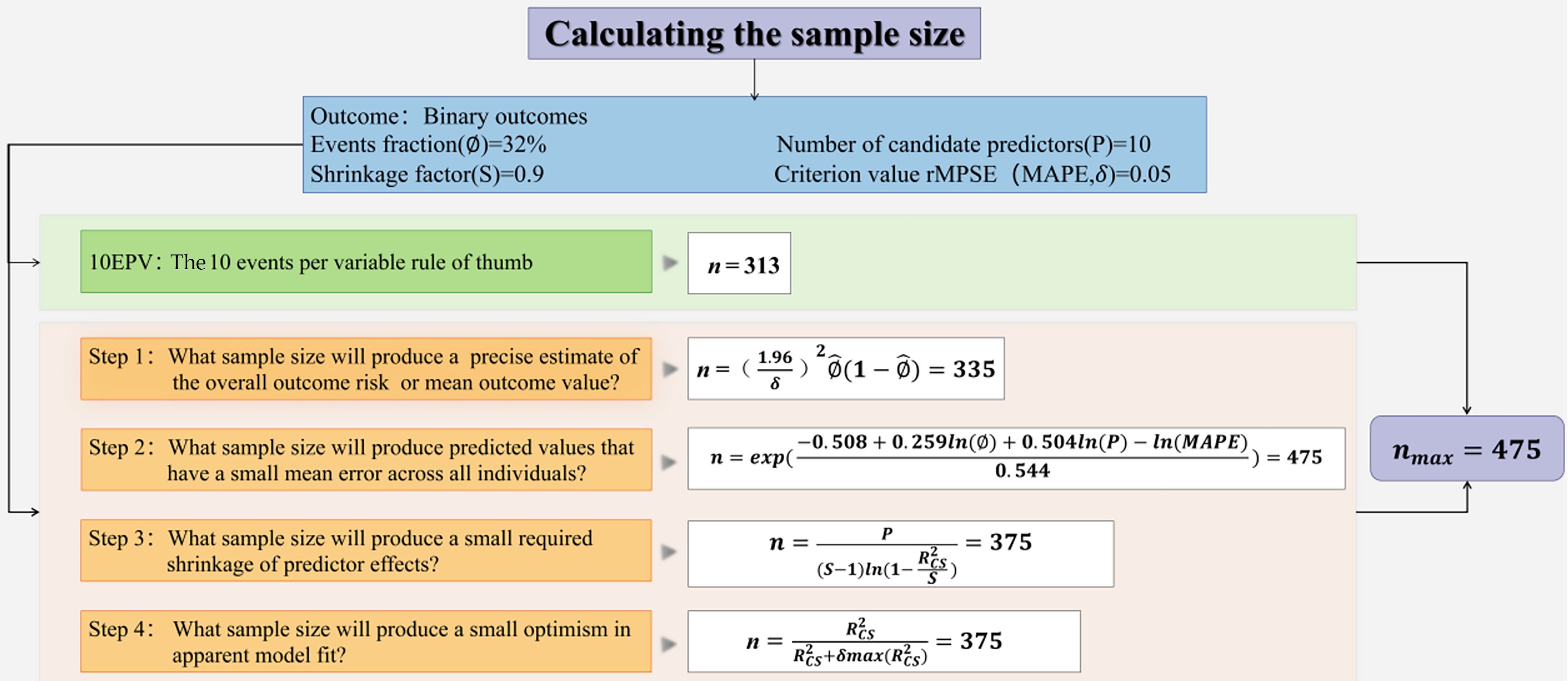 rMPSE: Root mean squared prediction error; MPSE: Mean squared prediction error; EPV: Events per variable. In formula: Ø: Events fraction; δ: A margin of error, generally recommend < 0.05; P: Number of candidate predictors; S: Shrinkage factor; R2cs: A (conservative) value for the anticipated model performance is required, as defined by the Cox-Snell R squared statistic; MAPE: The mean absolute prediction error; n: The sample size.