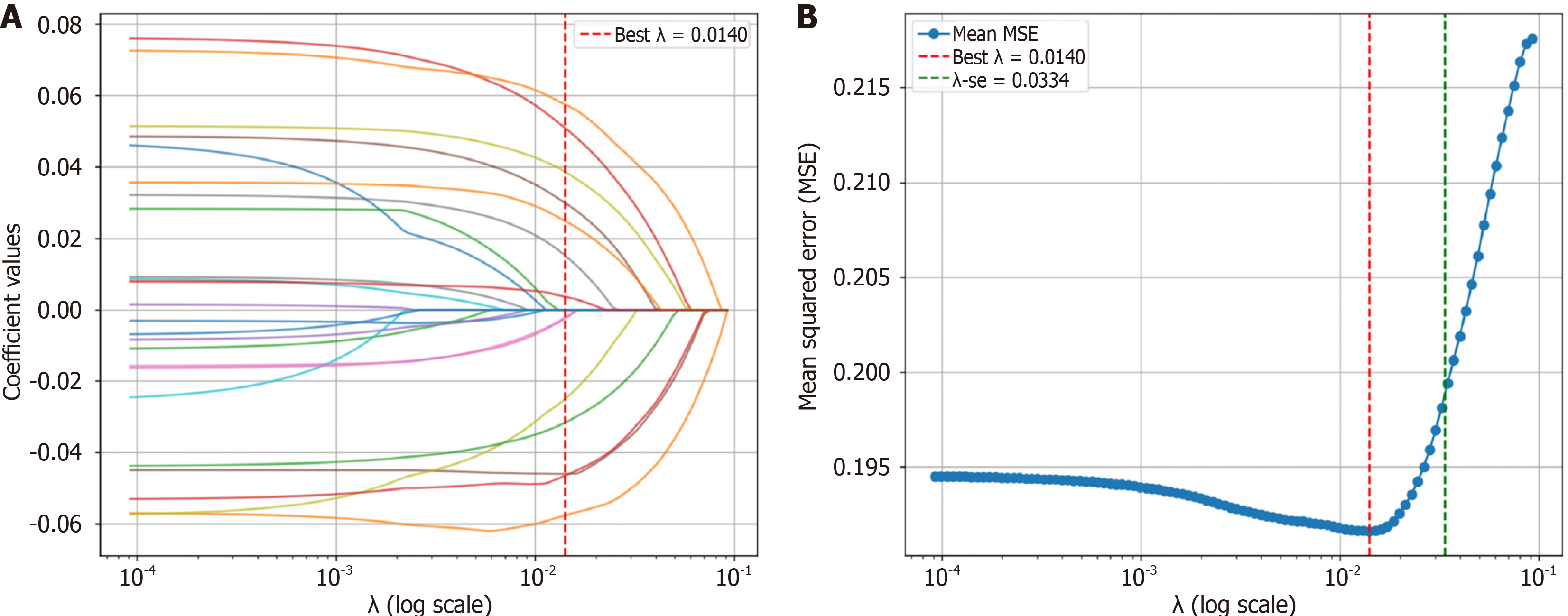 A: Path diagram of least absolute shrinkage and selection operator (LASSO) regression coefficients for candidate predictors; B: Cross-validation curves for LASSO. MSE: Mean squared error.