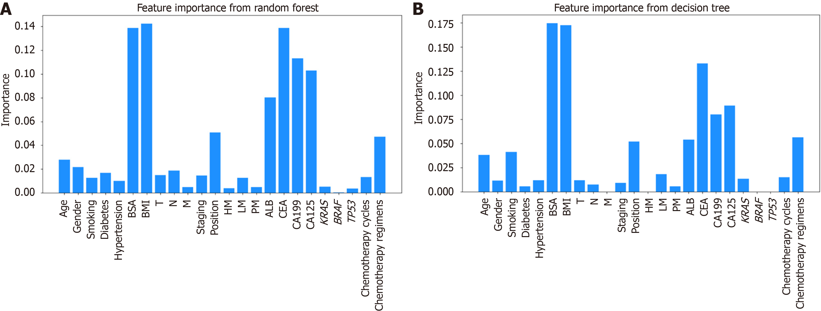 A: Random forest algorithm; B: Decision trees algorithm. BSA: Body surface area; BMI: Body mass index; T: Tumor; N: Node; M: Metastasis; HM: Hepatic metastasis; LM: Lung metastasis; PM: Peritoneal metastasis; ALB: Albumin; CEA: Carcinoembryonic antigen; CA: Carbohydrate antigen.