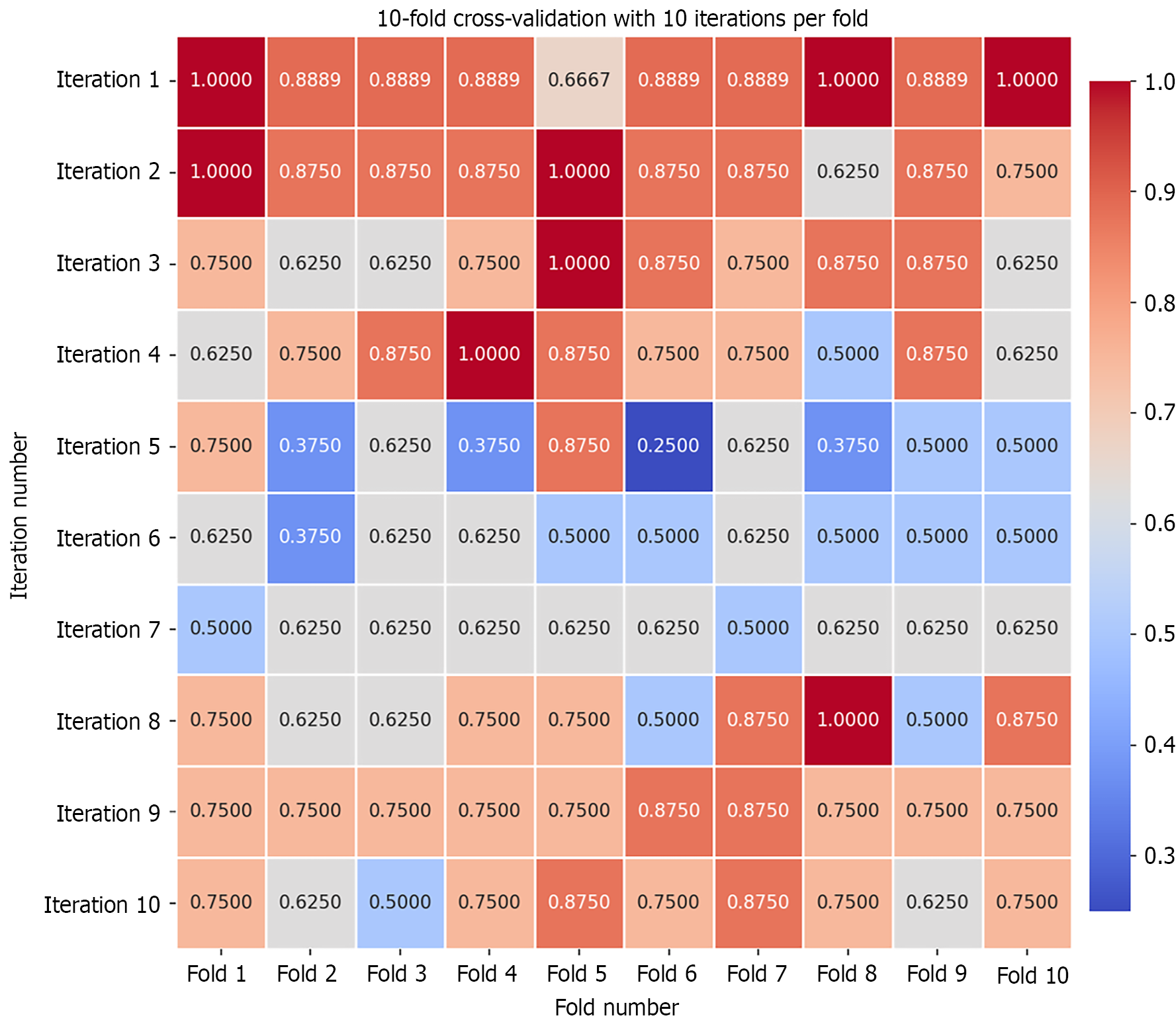 Model validation: The initial dataset was split into a training set and a validation set in an 8:2 ratio using Python’s pandas library. During model development, the more robust 10-fold cross-validation approach was adopted to fully leverage the available data, minimize random bias, and enhance both the stability and generalizability of the models. This method has been widely recommended for achieving reliable performance metrics[22,23].