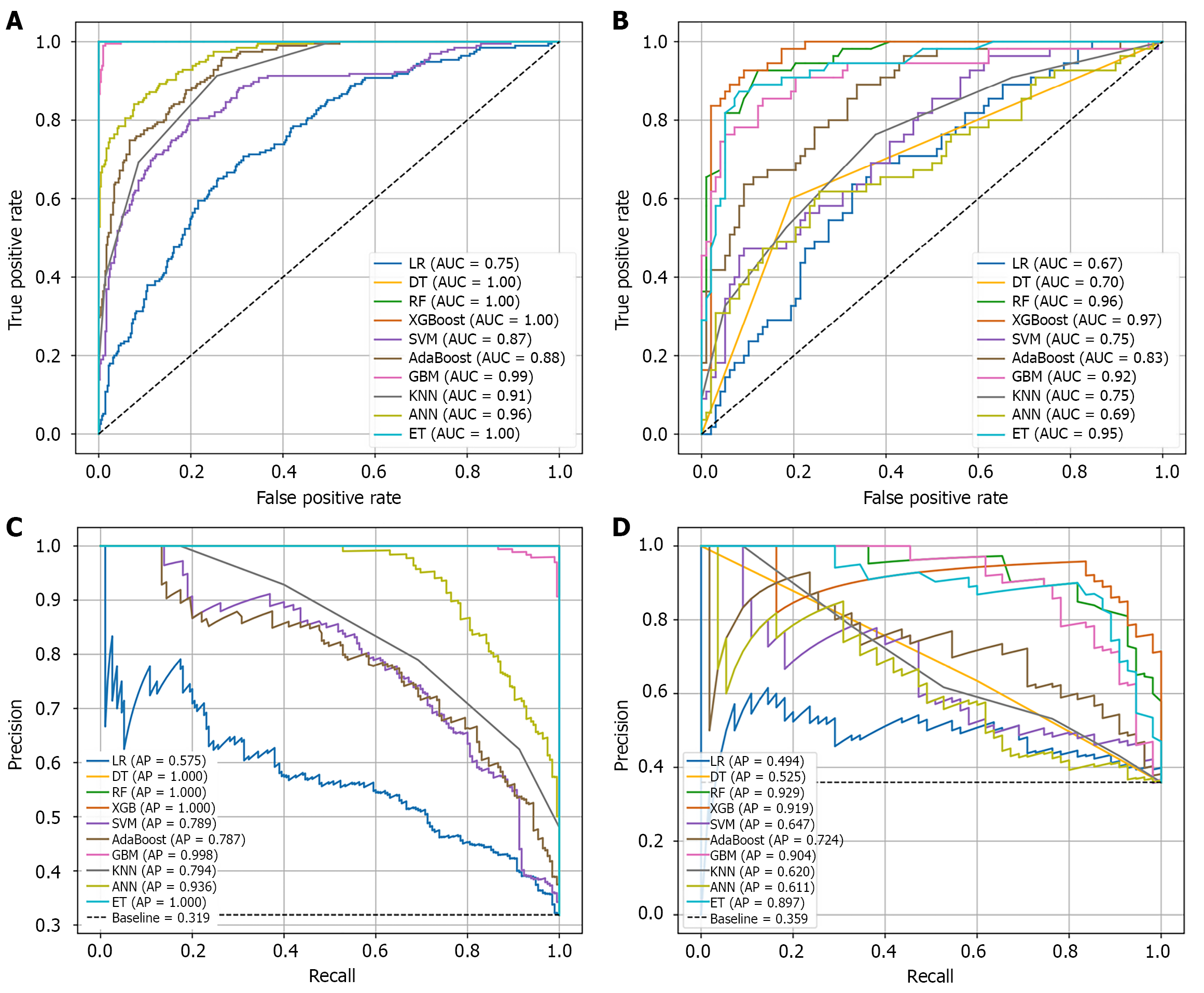 A and B: Receiver operating characteristic curves of training set (A) and validation set (B); C and D: Precision-recall curves of training set (C) and validation set (D). LR: Logistic regression; DT: Decision trees; RF: Random forest; XGBoost: Extreme gradient boosting; SVM: Support vector machines; GBM: Gradient boosting machines; KNN: K-Nearest neighbors; ANN: Artificial neural network; ET: Extreme trees; AUC: Area under the curve; AP: Average precision.