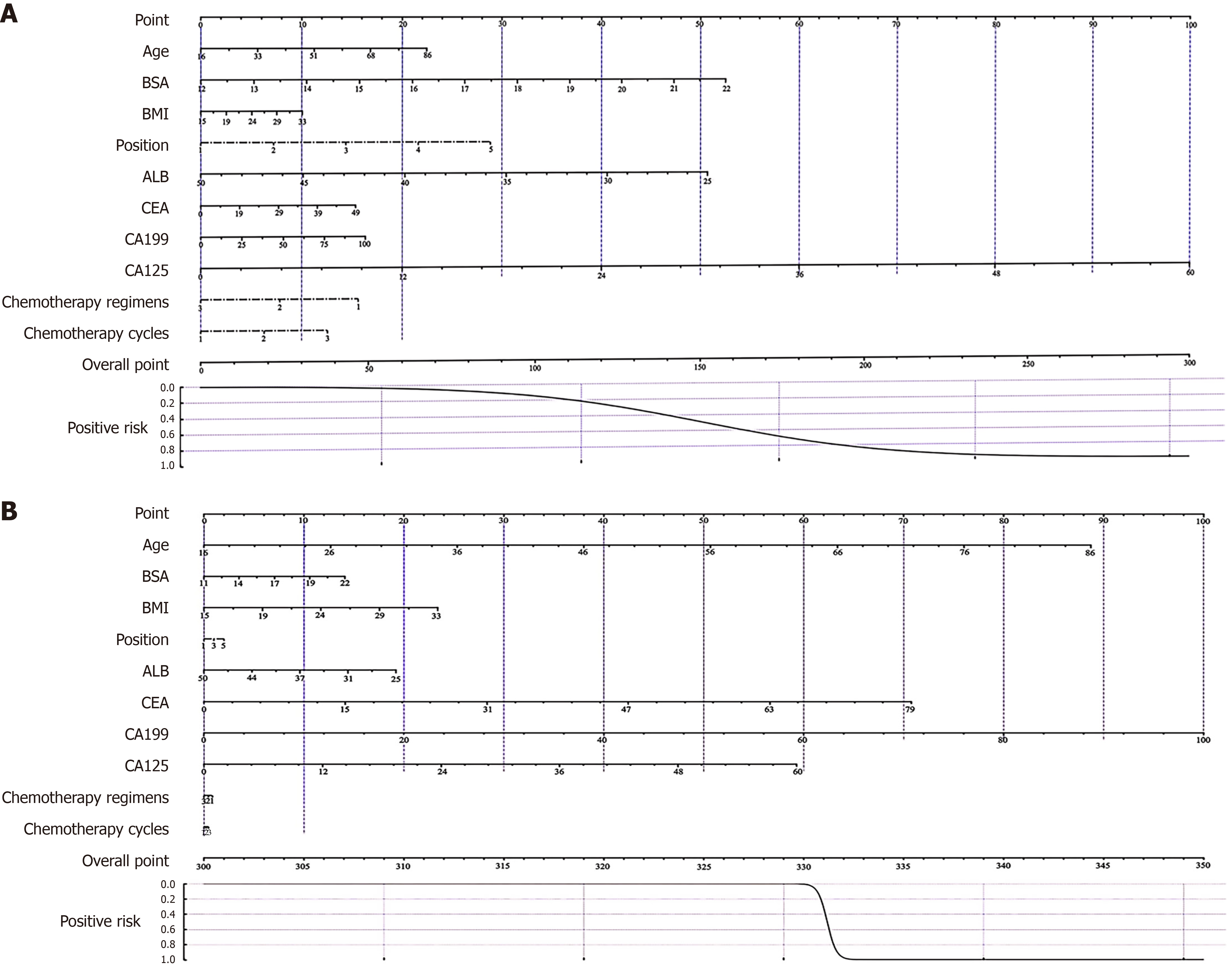A: Clinic-machine learning; B: Clinic. BSA: Body surface area; BMI: Body mass index; ALB: Albumin; CEA: Carcinoembryonic antigen; CA: Carbohydrate antigen.
