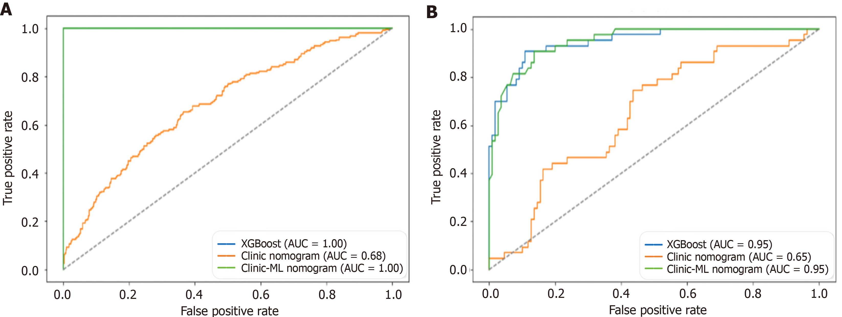 A nomogram is a visual statistical tool that integrates biological and clinical variables into a single graphical interface, facilitating prediction of outcome probabilities and aiding in clinical decision-making[29]. In this study, a multivariable ordinal LR approach was initially adopted to construct a conventional nomogram-based clinical prediction model (hereafter referred to as the “clinic-nomogram”). Subsequently, to combine the strong interpretability of the nomogram with the high accuracy of MLs, a FMA was employed to convert the optimal ML model into a clinic-ML nomogram. AUC, AUPRC, accuracy, sensitivity, specificity, F1 score, PPV, NPV, calibration curves and DCA were used to evaluate and compare the performances of the optimal ML, clinic nomogram, and clinic-ML nomogram, thereby identifying the best-performing clinical prediction model. This form of algorithmic stacking can further enhance model accuracy and generalizability, thereby improving its clinical utility[22].