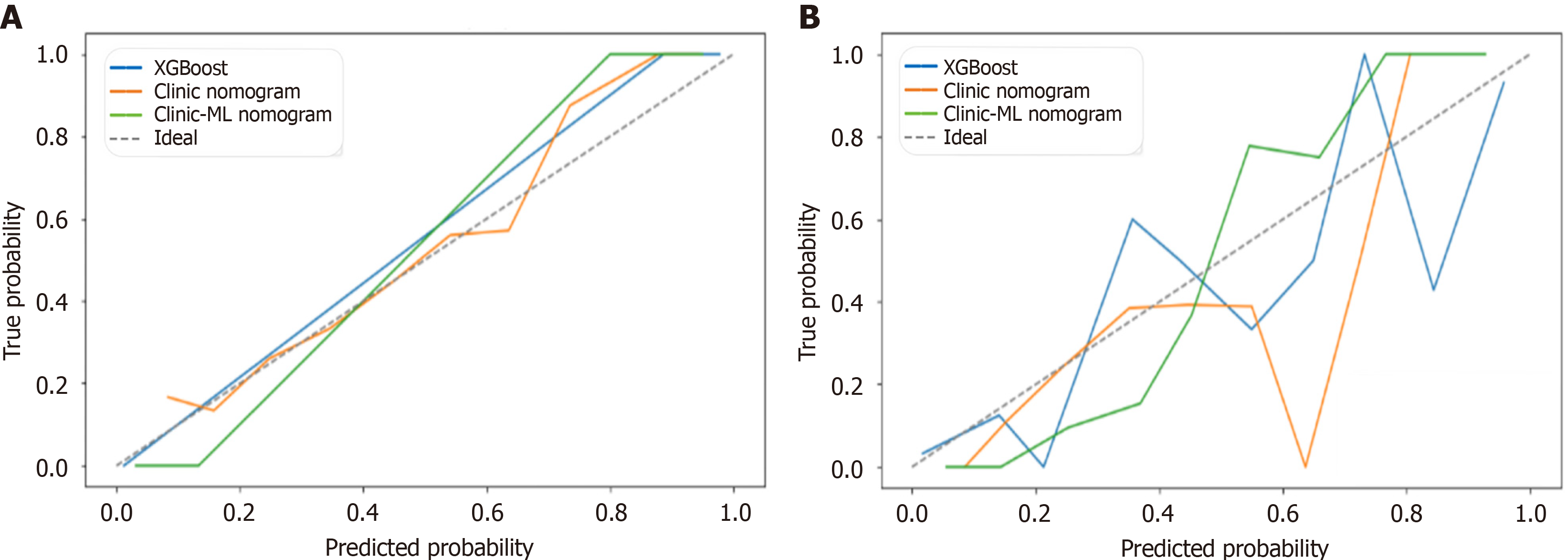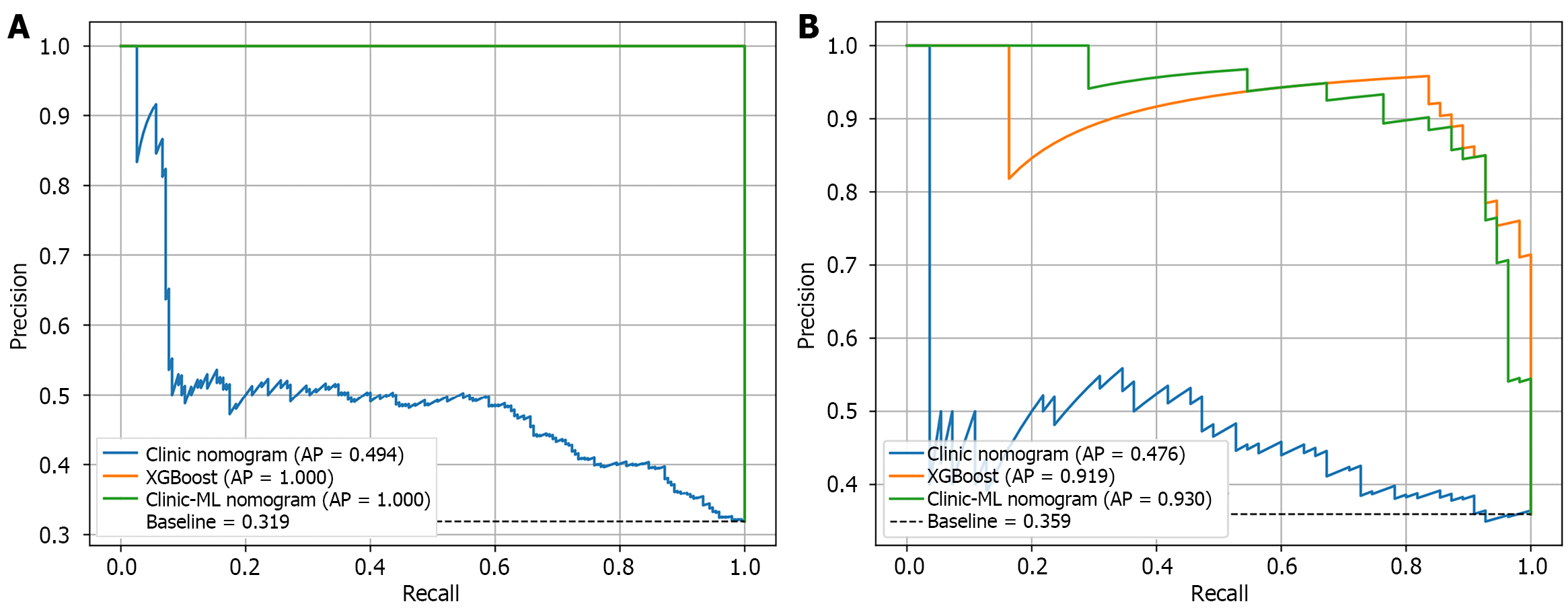 Evaluation of model performance: An effective clinical prediction model should exhibit both high discrimination and accurate calibration. Discrimination refers to the ability to correctly distinguish between binary outcomes, whereas calibration concerns the accuracy of predicted probabilities or risk estimates. In this study, eight metrics were used to evaluate model performance: Area under the receiver operating characteristic (ROC) curve (AUC), area under the precision-recall curve (AUPRC), accuracy, sensitivity, specificity, F1 score, positive predictive value (PPV), and negative predictive value (NPV). Among these, the AUC and the AUPRC served as the primary performance indicator, with values ranging from 0.5 to 1.0. Higher AUC values indicate stronger discrimination and greater accuracy. Conventionally, an AUC of 0.70-0.90 is considered moderate, whereas AUC > 0.90[24] is considered high-performance, thereby warranting further model construction. Unlike the AUC, the AUPRC provides a relative evaluation of predictive model performance, primarily judged by its degree of improvement over the random baseline. The ROC curve is generally insensitive to systematic error and demonstrates strong interpretability in datasets that are standardized, balanced, and relatively easy to interpret[24]. However, precision-recall curves are increasingly employed in clinical prediction model research because the inherent imbalance of clinical data highlights performance differences that ROC analysis may fail to capture[25]. Therefore, in the context of imbalanced clinical datasets, AUPRC can be compared with AUC to provide a more accurate and comprehensive assessment of the practical utility of prediction models in identifying low-probability events. To assess calibration, three main approaches are typically applied: (1) Mean calibration (calibration in the large) is assessed by comparing the average predicted outcomes or average predicted risks with the average observed outcomes or risks; (2) Fitting a calibration line on observations vs predictions; and (3) Fitting a smooth calibration curve to assess calibration locally. In this study, calibration curves were plotted to evaluate and determine the calibration properties and threshold values of the predictive models. The performance observed on the validation set was used as the primary yardstick to ensure the model’s complexity was optimized, thereby minimizing underfitting and overfitting. This process yielded the optimal ML[26].