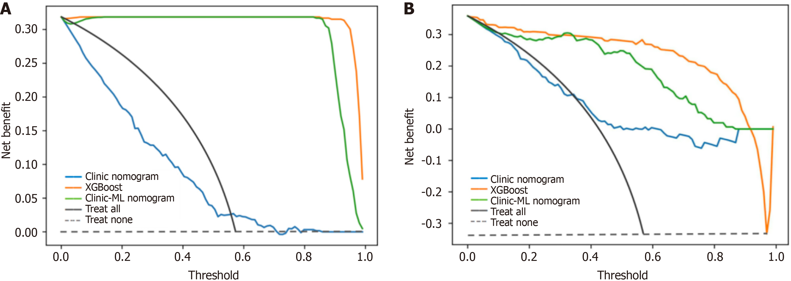 Clinical decision assessment of predictive models: In contrast to performance evaluation, decision curve analysis (DCA) focuses on the practical clinical utility of a model, drawing upon decision theory to weigh factors such as outcome incidence, therapeutic benefits, and potential harms. DCA is therefore better aligned with real-world clinical scenarios, offering a more comprehensive basis for clinical decision-making when used in conjunction with conventional performance metrics[27,28]. It is important to note that a model must exhibit satisfactory performance before DCA is applied, given the inherent interplay between predictive accuracy and clinical decision evaluation.