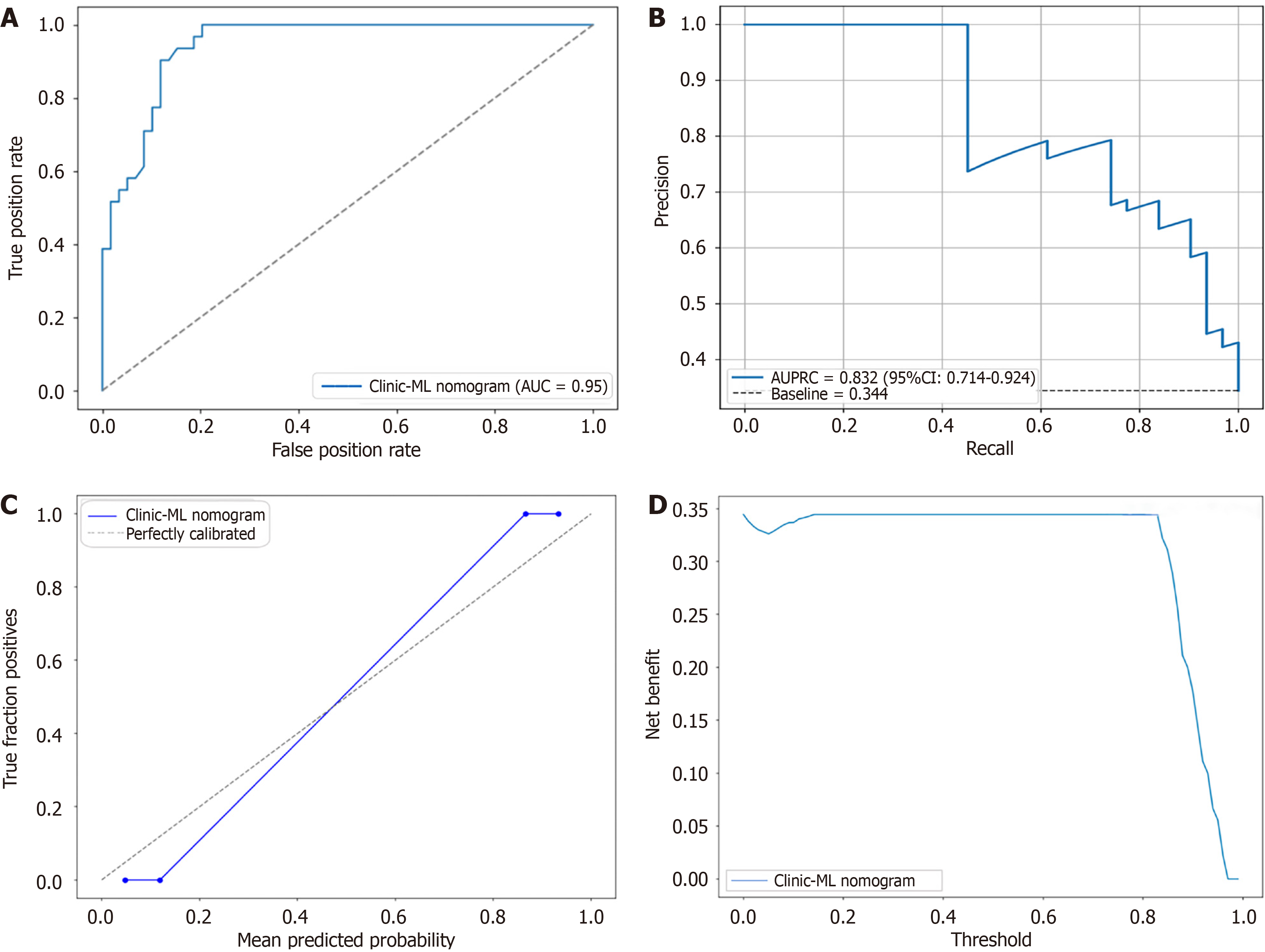 The optimal predictive model, identified in the previous steps, was subjected to internal testing using data from 90 participants in the testing set. The clinic-ML nomogram continued to exhibit favorable accuracy, discrimination, and calibration (Table 5), achieving an AUC of 0.95 (> 0.9), an AUPRC of 0.83 (compared to the random baseline, it increased by 2.41 times). Moreover, it demonstrated superior clinical decision-making performance, indicating the model’s potential for broader generalization and applicability (Figure 12).