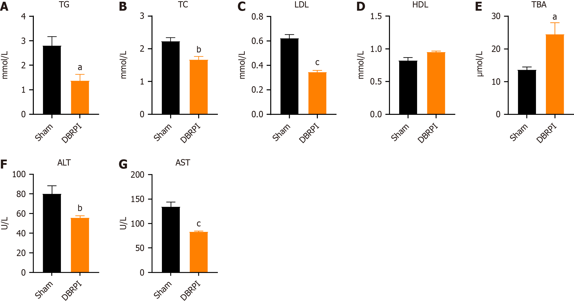 Six weeks post-surgery, the lipid profile of the DBRPI group significantly changed, as shown by reduced levels of TG (P < 0.05), TC (P < 0.01), and LDL (P < 0.001) (Figure 2A-D). Additionally, there was a notable increase in the level of TBA in the serum after DBRPI surgery (P < 0.05) (Figure 2E). The levels of serum ALT (P < 0.01) and AST (P < 0.001) in the DBRPI group also decreased to varying degrees (Figure 2F and G).