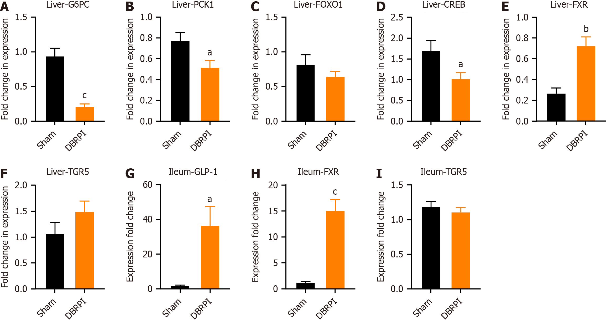 Compared with the sham group, the DBRPI group showed significantly lower expression of the gluconeogenic key enzyme-encoding genes glucose-6-phosphatase (G6PC) (P < 0.001) and phosphoenolpyruvate carboxykinase 1 (PCK1) (P < 0.05), along with significant inhibition of the activity of the transcription factor CREB (P < 0.05), which regulates gluconeogenesis (Figure 3A-D). Additionally, the expression levels of FXR (P < 0.0 and P < 0.001, respectively) and GLP-1 (P < 0.05) were significantly increased, while there was no significant change in the expression level of TGR5 in the terminal ileum (Figure 3E-I).