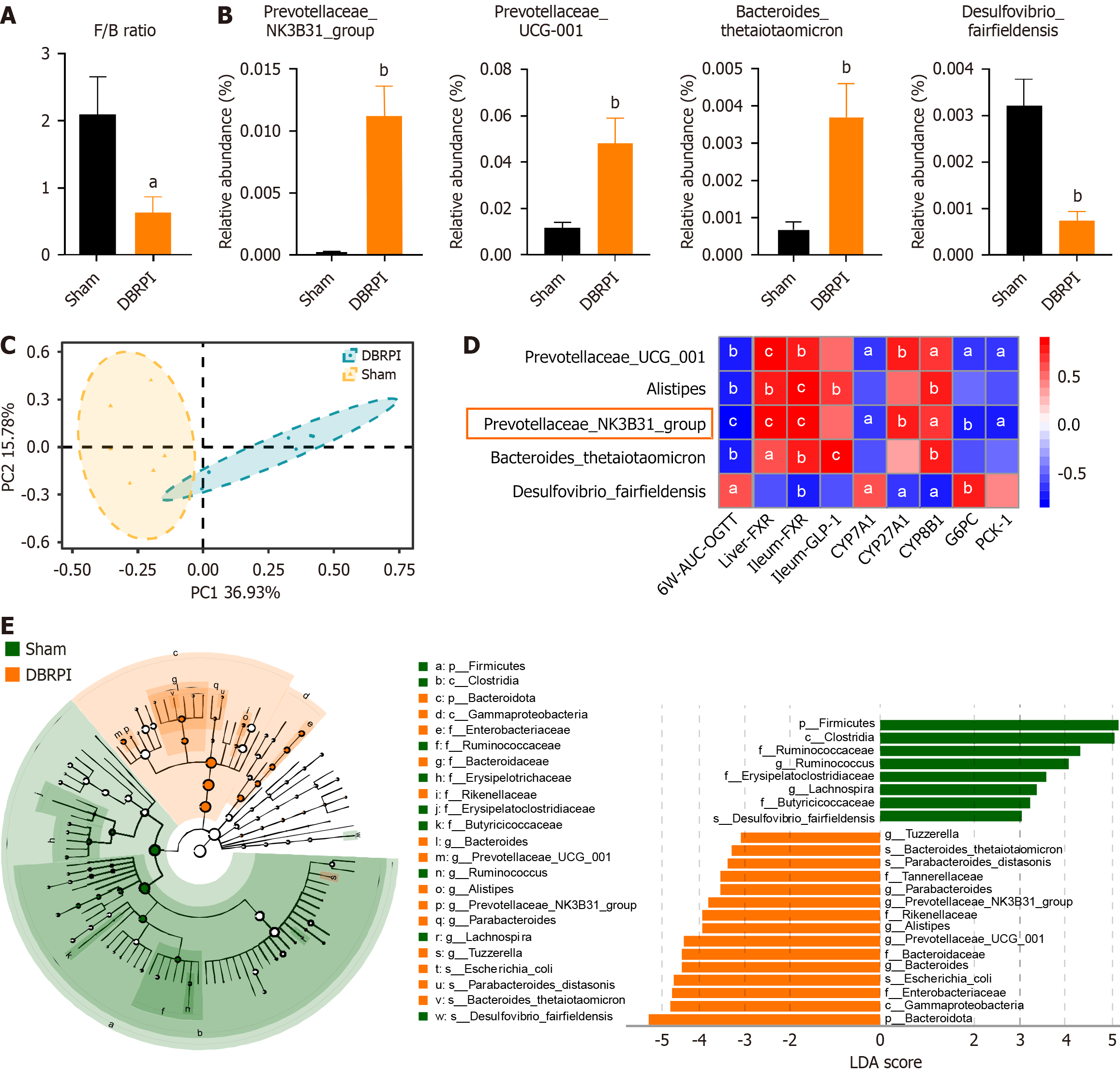 DBRPI decreased the abundance ratio of Firmicutes to Bacteroidetes in obese rats (P < 0.05) (Figure 4A). Compared with that in the sham group, the gut microbial abundance in the DBRPI group significantly changed after surgery, with principal coordinates analysis revealing significant differences in β-diversity between the two groups (P < 0.01) (Figure 4B and C). Furthermore, correlation analysis revealed that the abundance of the Prevotellaceae_NK3B31_group was negatively correlated with AUC-OGTT, G6PC, and PCK1 Levels and positively correlated with liver and terminal ileum FXR, CYP27A1 (key initiating and rate-limiting enzyme in the alternative bile acid synthesis pathway), and CYP8B1 (regulation of the cholic acid to CDCA ratio) levels (Figure 4D). Linear discriminant analysis revealed increased abundances of bacteria such as Prevotellaceae UCG-001, Alistipes, Prevotellaceae_NK3B31_group, Parabacteroides distasonis, and Bacteroides thetaiotaomicron after DBRPI surgery, whereas the abundance of Desulfovibrio fairfieldensis increased in the sham group (Figure 4E).