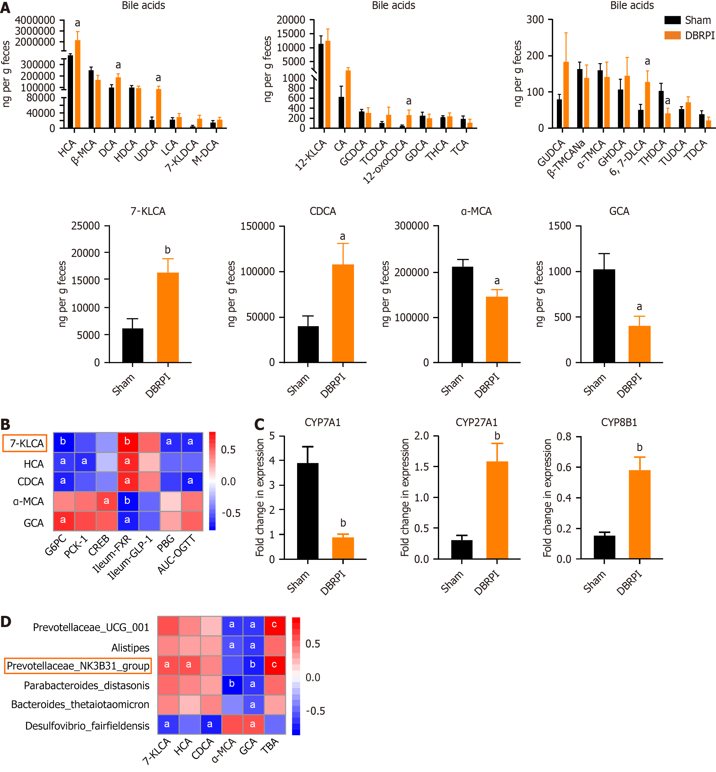 Six weeks after surgery, significant changes in bile acid levels were observed in the feces of rats in the DBRPI group. Specifically, compared with those in the sham group, the levels of 7-KLCA (P < 0.01), hyocholic acid (HCA) (P < 0.05), CDCA (P < 0.05), deoxycholic acid (P < 0.05), ursodeoxycholic acid (UDCA) (P < 0.05), and 12-oxolithocholic acid (P < 0.05) were significantly elevated in the DBRPI group, whereas the levels of α-MCA (P < 0.05), glycocholic acid (GCA) (P < 0.05), and taurohydrodeoxycholic acid (P < 0.05) were significantly reduced (Figure 5A). Further correlation analysis revealed a negative correlation between 7-KLCA and G6PC, PBG, and AUC-OGTT levels and a positive correlation with FXR levels (Figure 5B). Additionally, DBRPI upregulated the expression of the bile acid synthase genes CYP27A1 and CYP8B1, but downregulated the expression of CYP7A1 (all P < 0.01) (Figure 5C). Further correlation analysis revealed a positive correlation between Prevotellaceae_NK3B31_group abundance and 7-KLCA, HCA, and TBA levels and a negative correlation with GCA levels (Figure 5D).