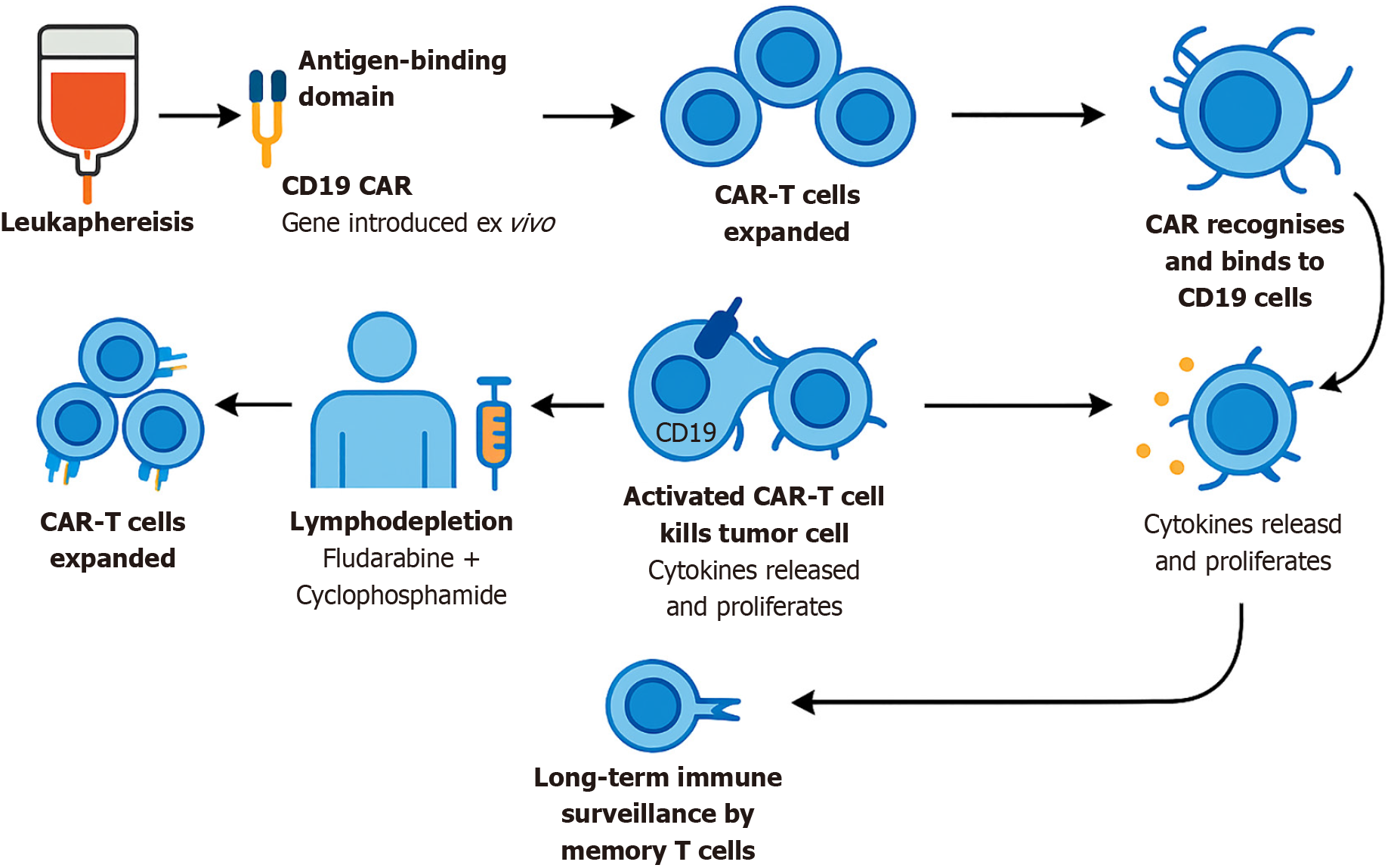 Three CD19-directed CAR-T products axi-cel, tisa-cel, and liso-cel have been approved for B-cell malignancies[20]. Axi-cel demonstrated strong efficacy but at the cost of higher toxicity, with grade ≥ 3 CRS and ICANS rates up to 13% and 28%, respectively[14,21]. Tisa-cel showed favorable safety but variable efficacy and longer manufacturing times[22,23]. Liso-cel offers balanced efficacy and lower toxicity, permitting outpatient use in select centers[14,24]. These differences in efficacy, safety, and logistics underscore the importance of individualized selection among the three CAR-T products[25-27]. Furthermore, real-world data continue to validate these findings, demonstrating that liso-cel maintains comparable efficacy with reduced incidence of high-grade immune toxicities even in older or comorbid patients[28-30].