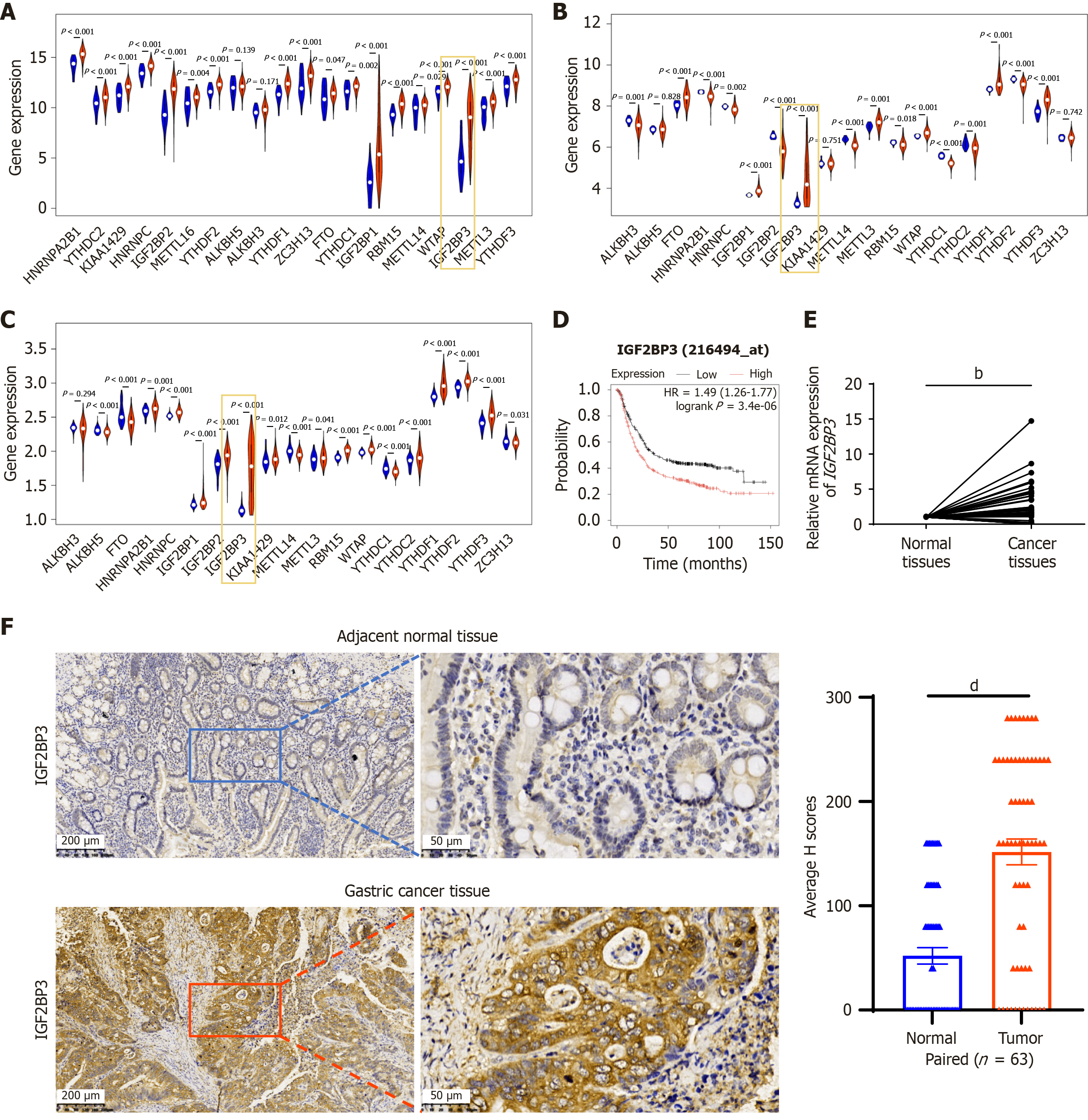 In recent years, the role of epigenetics in the pathogenesis of GC has attracted extensive research attention worldwide. Epigenetics refers to chemical modifications to DNA and RNA, the main forms of which are DNA and RNA methylation, histone modification, non-coding RNA modification, and chromatin rearrangement[7]. The N6-methyladenosine (m6A) modification is of particular interest, as it represents the most common internal modification of eukaryotic messenger RNA (mRNA) and regulates the stability, translation efficiency, alternative splicing, and localization of RNA at the post-transcriptional level. It also participates in various biological processes including initiation, proliferation, differentiation, metastasis, and metabolic reprogramming of tumor cells[8,9]. The majority of m6A-related proteins are methyltransferases, demethylases, or ‘readers’, encoded by 20 genes[10]. The main function of m6A readers is to interpret RNA methylation modifications and regulate the subsequent translation and degradation of the RNA[11,12]. IGF2BP3, an m6A reader, is located on human chromosome 7p15.3 and contains two RNA recognition motifs and four K homologous domains[13]. Its primary role is to recognize m6A binding sites through the K homology domain, thereby increasing the stability and translation efficiency of target mRNAs[14]. Overexpression of IGF2BP3 was first observed in pancreatic cancer[15] and has since been implicated in the development of various cancers, with distinct roles in each. For instance, IGF2BP3 enhances the stability of TMBIM6 mRNA by binding to its m6A site, thereby promoting the progression of laryngeal squamous cell carcinoma[16]. Similarly, in hepatocellular carcinoma, it stabilizes and increases the expression of lnc-CTHCC (cancer-testis associated long non-coding RNA) by recognizing its m6A site, facilitating the progression of the disease[17]. In colorectal cancer, IGF2BP3 stabilizes CCND1 mRNA via its m6A site, promoting CCND1 protein expression, which in turn affects regulation of the cell cycle and promotes proliferation and growth of cancer cells[18]. Furthermore, Wang et al[19] found that m6A reader IGF2BP2 enhanced the mRNA stability of GLUT1, a key gene in aerobic glycolysis, in an m6A-dependent manner, thereby significantly promoting aerobic glycolysis of colorectal cancer cells. Taken together, these findings indicate that IGF2BP3 may be a critical oncoprotein.