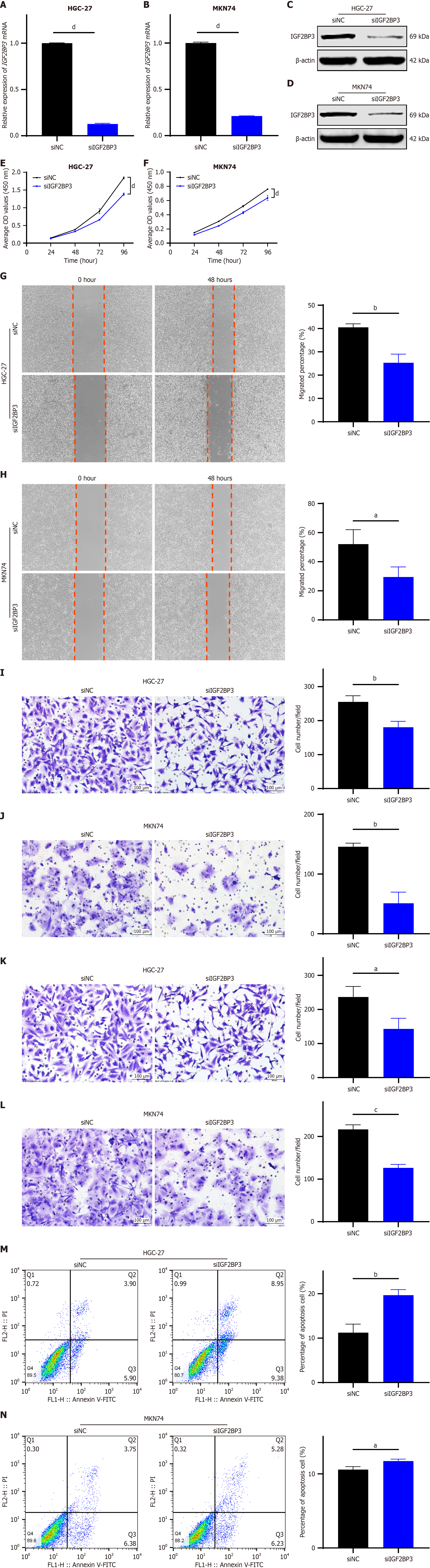 To investigate the mechanism of action of IGF2BP3 in GC, we first assessed the mRNA (Supplementary Figure 1A) and protein (Supplementary Figure 1B) expression levels of IGF2BP3 in GES-1, HGC-27, AGS, MKN74, and MKN7 cells. Results indicated that the expression levels of IGF2BP3 mRNA and protein were relatively high in both HGC-27 and MKN74 cells. Therefore, we further performed knockdown of IGF2BP3 in these cell types to determine its impact on cellular function. Two IGF2BP3 siRNAs were transfected simultaneously into HGC-27 and MKN74 cells, and the one with significantly better knockdown efficiency (siRNA-IGF2BP3-2) was selected for subsequent experiments (Supplementary Figure 1C and D). Following transfection with siRNA-IGF2BP3-2 (siIGF2BP3) and a siNC, both mRNA (Figure 2A and B) and protein (Figure 2C and D) levels of IGF2BP3 were significantly reduced. The CCK-8 assay revealed marked inhibition of cell proliferation after knockdown of IGF2BP3 (Figure 2E and F), and wound healing (Figure 2G and H) and transwell migration (Figure 2I and J) assays demonstrated that knockdown of IGF2BP3 significantly suppressed cell migration. Furthermore, the transwell invasion assay showed that the reduction in IGF2BP3 expression significantly impaired the invasion capability of the cells (Figure 2K and L), and flow cytometry analysis showed that silencing IGF2BP3 increased apoptosis of cells of both types (Figure 2M and N). To minimize the potential for off-target effects, an additional siRNA targeting IGF2BP3 was designed and transfected into HGC-27 and MKN74 cells for subsequent functional assays (Supplementary Figure 2). Based on the above results, it can be concluded that downregulation of IGF2BP3 seems to inhibit proliferation, migration, and invasion of GC cells and promote their apoptosis.