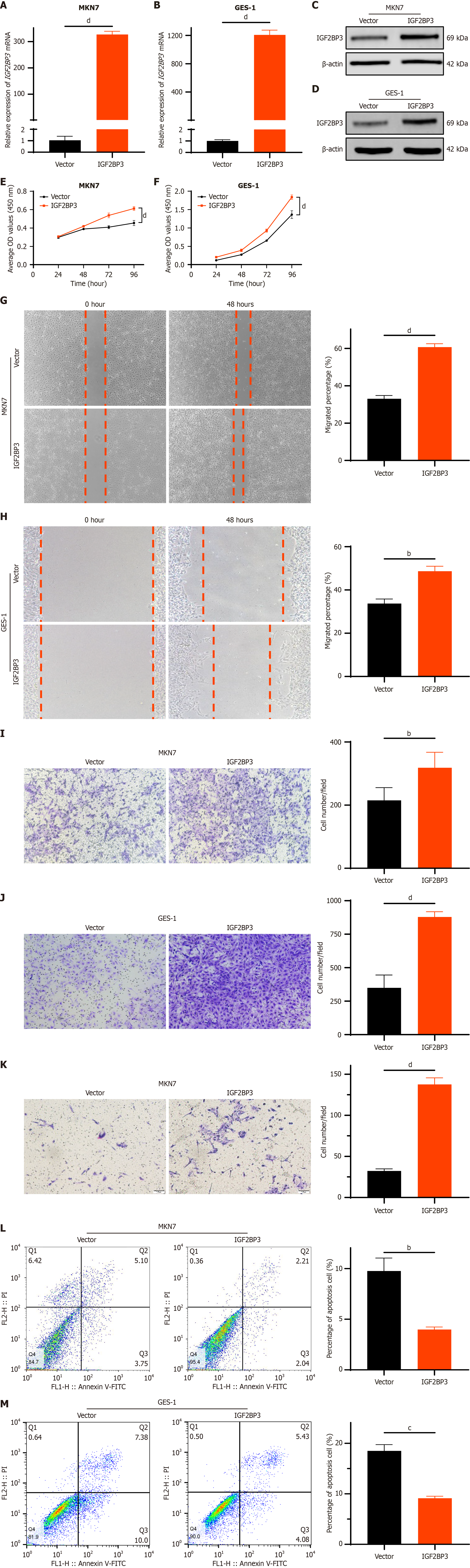 To further investigate the impact of IGF2BP3 on cellular biological functions, we overexpressed it in MKN7 and GES-1 cells, which exhibit relatively low endogenous expression levels. After transfecting cells with pcDNA3.1-IGF2BP3 (IGF2BP3-overexpression) and pcDNA3.1 (control) vectors, we observed significant increases in IGF2BP3 mRNA (Figure 3A and B) and protein (Figure 3C and D) levels. CCK-8 assay showed that cell proliferation was notably enhanced following overexpression of IGF2BP3 (Figure 3E and F), and wound healing (Figure 3G and H) and transwell migration (Figure 3I and J) assays demonstrated significantly increased migration capability. Furthermore, according to the transwell invasion assay, elevated IGF2BP3 expression significantly enhanced the invasion ability of cells (Figure 3K) (although GES-1 cells were not able to penetrate the matrix glue at the base of the transwell chambers, owing to the inherently weaker invasiveness of normal epithelial cells). Flow cytometry analysis demonstrated reduced apoptosis levels among both MKN7 and GES-1 cells with IGF2BP3 overexpression (Figure 3L and M). These results show that overexpression of IGF2BP3 can promote proliferation, migration, and invasion of GC cells and inhibit their apoptosis, suggesting that IGF2BP3 may function as an oncogene in GC.