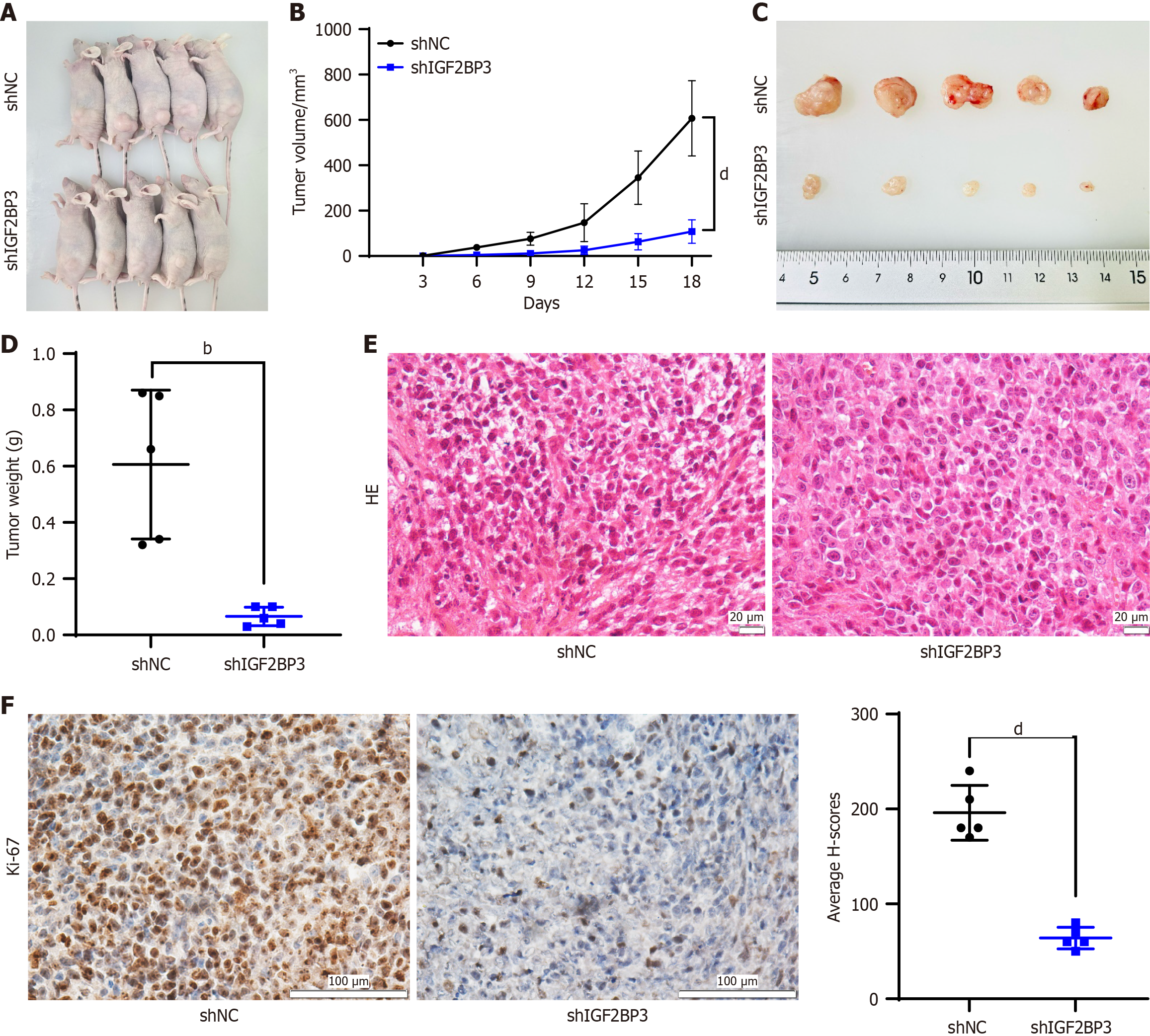 Ten male BALB/c nude mice aged 4-6 weeks, weighing 16-20 g (procured from Beijing Huafukang Biotechnology Co., Ltd.) were randomly divided into two groups (five mice per group) and housed in a pathogen-free environment with sufficient water and food. The room was maintained at a temperature of approximately 22 °C and a 12-hour light/12-hour dark cycle. On a clean bench, the skin of the left hind limb flank of each nude mouse was disinfected, and HGC-27-shNC and HGC-27-shIGF2BP3 cells (5 × 106 cells per mouse) were subcutaneously injected using a sterile syringe. Starting from day 3 post-injection, tumor size was evaluated every 2 days using following formula: Volume = (long diameter × short diameter2)/2. When the tumor volume approached 1000 mm3, the nude mice were euthanized humanely. Tumor specimens were collected, photographed, weighed, and fixed in formalin. The tumor samples were then paraffin-embedded and sectioned for subsequent hematoxylin and eosin and IHC analysis. These experiments were approved by the Ethics Committee of the First Hospital of Hebei Medical University and carried out in accordance with the experimental animal care and use system.