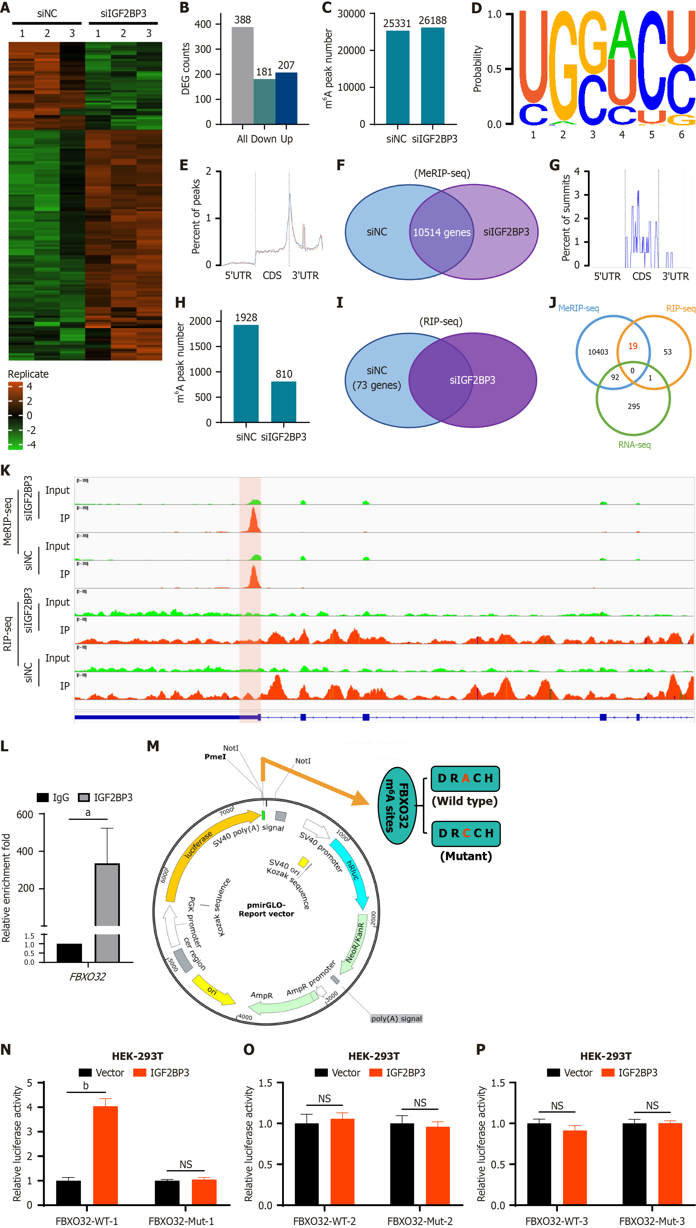 Further analyses of these candidate genes included examination of their expression in GC tissues, their subcellular localization, their associations with survival of GC patients, and the abundance and loci of m6A on their mRNA. FBXO32 was found to be highly expressed in GC tissues based on TCGA data (Supplementary Figure 5A) and predominantly distributed in the cytoplasm and nucleus (Supplementary Figure 5B); moreover, the overall survival of patients with high expression of FBXO32 was poor (Supplementary Figure 5C), and the binding site of IGF2BP3 colocalize with m6A site on FBXO32 transcript (Figure 5K). These results suggest that IGF2BP3 may regulate FBXO32 in an m6A-dependent manner, thereby enhancing the malignant phenotype of GC. To verify this hypothesis, an RIP-qPCR assay was performed. The results indicated that IGF2BP3 protein could significantly enrich FBXO32 mRNA (Figure 5L). Subsequently, we used the catRAPID website to predict the presence of an m6A-binding site between IGF2BP3 protein and FBXO32 mRNA (Supplementary Figure 5D). Finally, to further elucidate the regulatory relationship between IGF2BP3 and FBXO32, we constructed luciferase reporter vectors containing either wild-type or m6A site-mutated sequences of FBXO32. The m6A sites on the FBXO32 transcript were predicted using the SRAMP database, and the top three high-scoring sites (1427, 1399, and 1493) were subjected to mutagenesis by substituting adenine with cytidine (Figure 5M). Overexpression of IGF2BP3 significantly enhanced luciferase activity in cells with the wild-type sequence site 1427, whereas no notable change was observed in the corresponding mutant group (Figure 5N). Notably, neither the wild-type nor mutant constructs for the other two sites resulted in significant alterations in luciferase activity (Figure 5O and P). These findings suggest that IGF2BP3 may exert its regulatory role by specifically targeting the m6A site at position 1427 on FBXO32 mRNA. Collectively, these data indicate that IGF2BP3 regulates FBXO32 in GC through an m6A-dependent mechanism.
