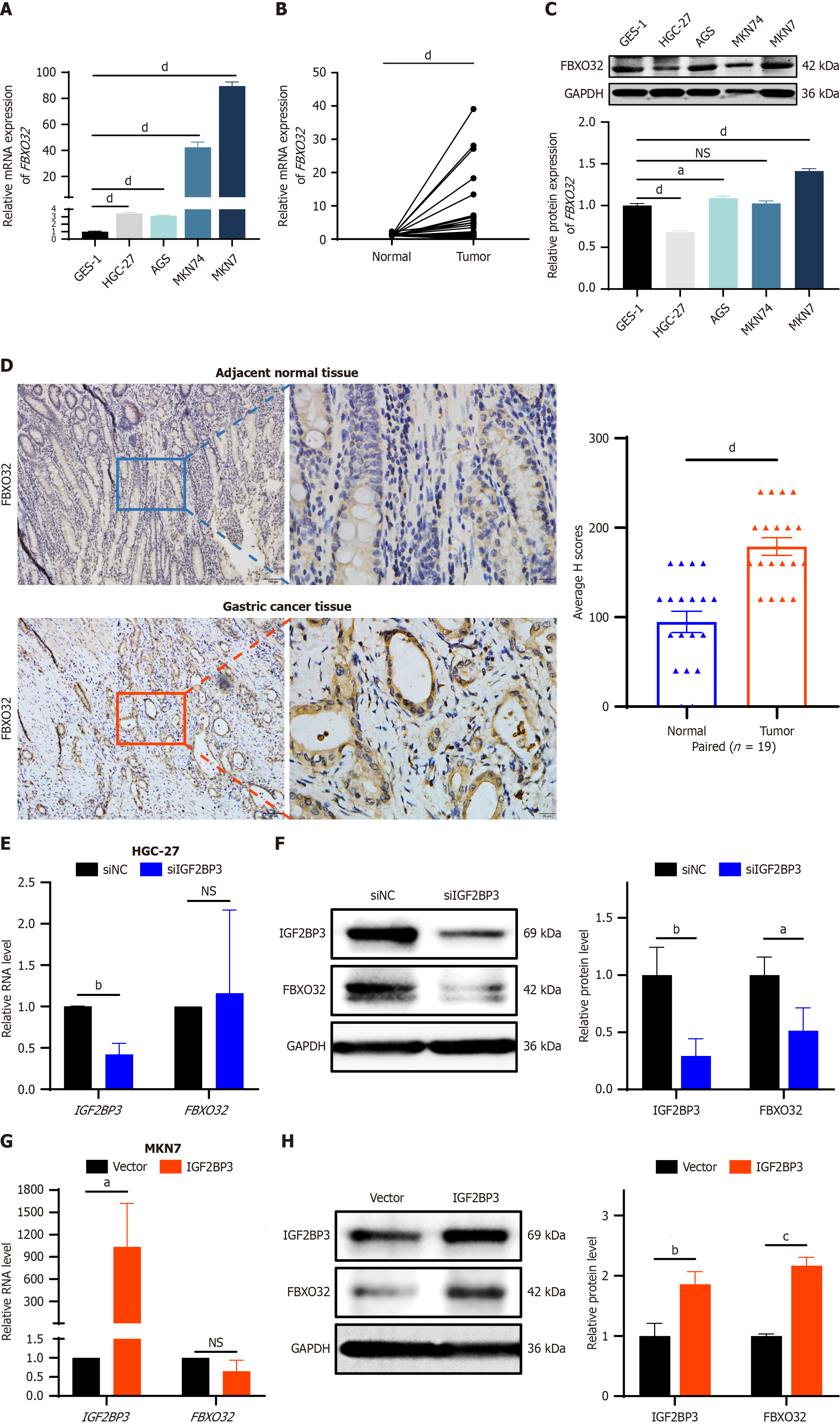 Next, we verified the expression of FBXO32 in GC cell lines and GC tissues. FBXO32 mRNA expression was higher in GC cell lines than in normal gastric mucosal cells (Figure 6A) and in tumor tissues compared to adjacent normal tissues (34 pairs of GC paired tissues) (Figure 6B). Moreover, the expression level of FBXO32 protein was also elevated in the majority of GC cell lines (Figure 6C) and was increased in tumor tissues relative to their matched adjacent normal tissues (19 pairs of GC paired tissues) (Figure 6D). These results suggest that FBXO32 may act as an oncogene in the pathogenesis of GC. To further confirm the regulation of FBXO32 expression by IGF2BP3 in GC cells, we examined transcriptional and translational changes in the expression of FBXO32 after IGF2BP3 knockdown or overexpression. After downregulation of IGF2BP3 expression in HGC-27 cells, there was no significant change in expression levels of FBXO32 mRNA (Figure 6E); however, FBXO32 protein expression was downregulated (Figure 6F). Similarly, when IGF2BP3 expression was upregulated in MKN7 cells, FBXO32 showed no significant change in terms of mRNA expression levels (Figure 6G), but its protein expression levels increased significantly (Figure 6H). These findings indicate that IGF2BP3 regulates the expression of FBXO32 at the translational rather than the transcriptional level, consistent with our initial hypothesis and with the mechanistic roles of other m6A reader proteins[20]. In conclusion, these results indicate that IGF2BP3 and FBXO32 interact with each other in GC, and IGF2BP3 can regulate the protein expression of FBXO32.