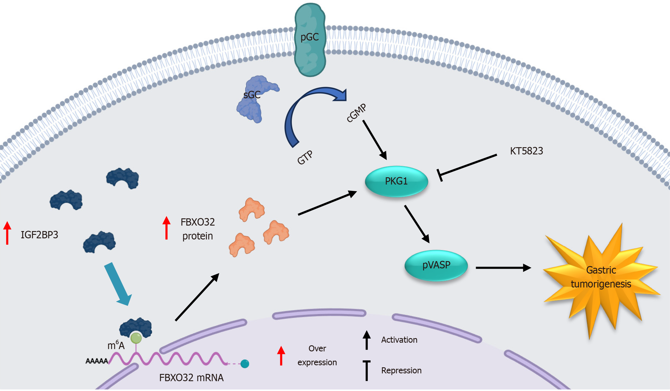 Core Tip: IGF2BP3 is highly expressed in gastric cancer and is closely associated with poor patient prognosis. IGF2BP3 promotes gastric cancer growth and progression both in vivo and in vitro. Mechanistically, IGF2BP3 recognizes and binds to N6-methyladenosine-modified site on FBXO32 messenger RNA, thereby upregulating FBXO32 protein expression. This activates the downstream cyclic guanosine monophosphate-protein kinase G (cGMP-PKG) signaling pathway, thereby regulating multiple biological functions of gastric cancer cells and promoting tumor progression. We propose that targeting of the IGF2BP3/FBXO32/cGMP-PKG axis could represent a promising therapeutic modality for gastric cancer.