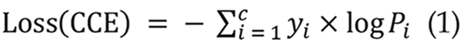 In CNN models, the loss function is a crucial statistic for assessing the disparity between anticipated and actual outcomes. It is reduced during training to enhance the model's forecast accuracy. Prevalent loss functions comprise mean squared error (MSE)[29], Cross-Entropy[30], and BCE[31]. This work utilizes the categorical cross-entropy loss function[32] within the CNN model, applicable for multi-class classification tasks where output labels are represented by one-hot encoded values of 0 or 1 as presented in Equation 1: