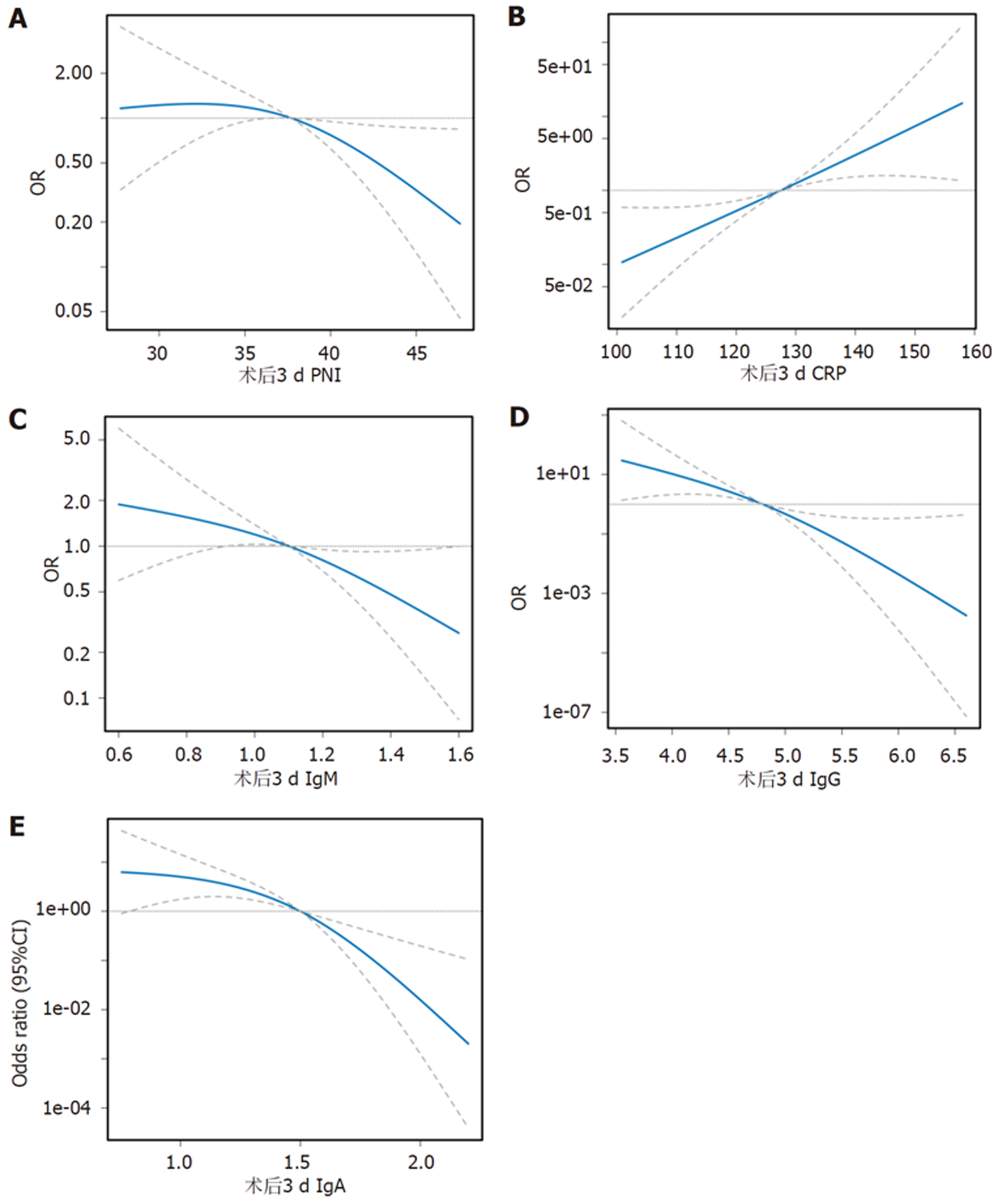 根据近因效应选择术后3 d PNI、CRP、免疫球蛋白水平绘制平滑曲线评估其与老年胃癌根治术后并发症的关系, 拟合发现CRP水平与老年胃癌根治术后并发症呈线性正相关关系, PNI、IgM、IgG、IgA水平与老年胃癌根治术后并发症呈线性负相关关系(P<0.05), 见图1.