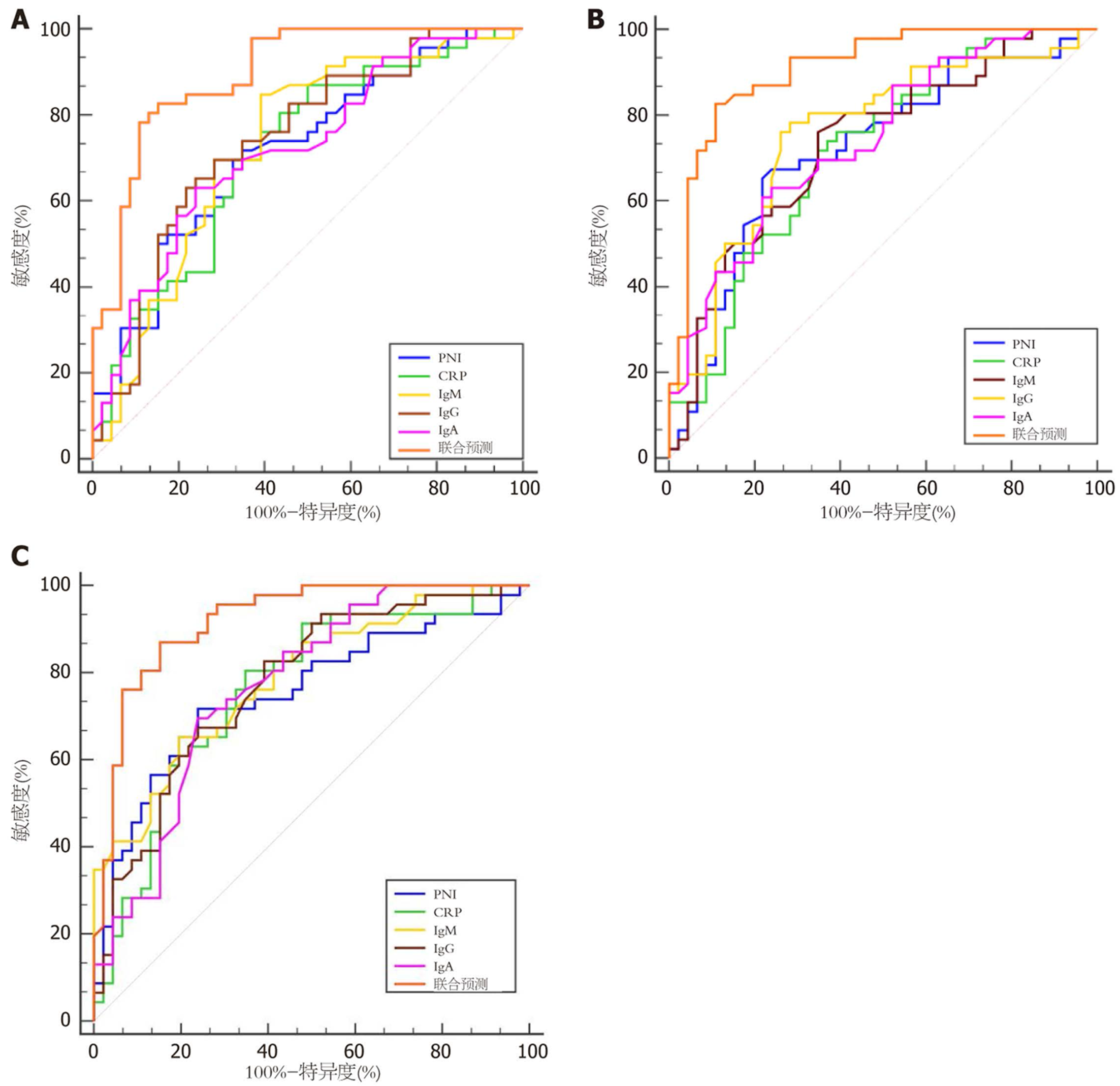 以术后发生并发症为阳性, 术后未发生并发症为阴性, 绘制预测老年胃癌根治术后并发症的ROC曲线. 结果显示, 术后1 d、3 d PNI、CRP、免疫球蛋白水平预测老年胃癌根治术后并发症的AUC均>0.7, 并随时间延长, AUC值逐步升高, 且PNI、CRP、免疫球蛋白联合预测的AUC值最大, 见图2、表3.