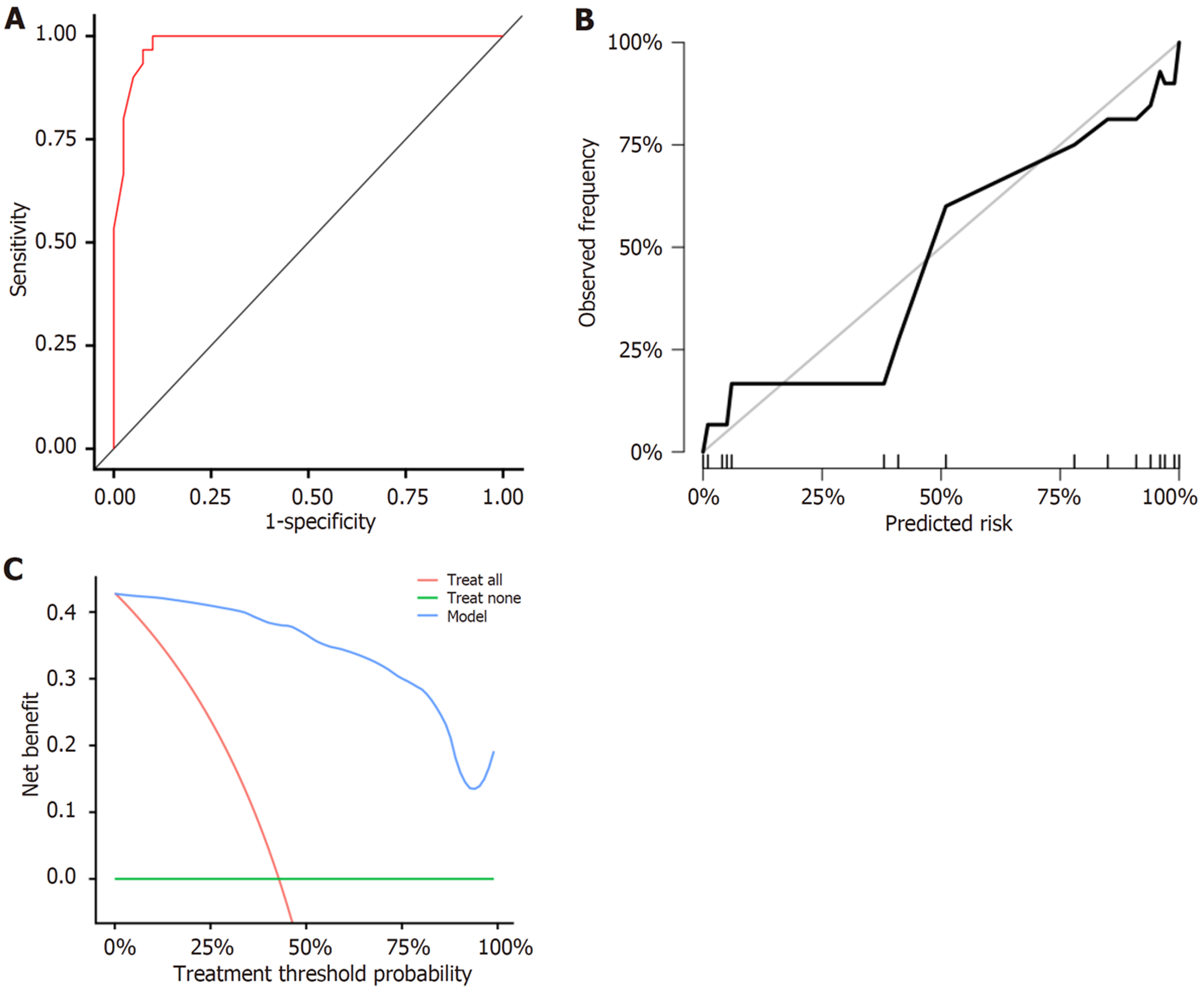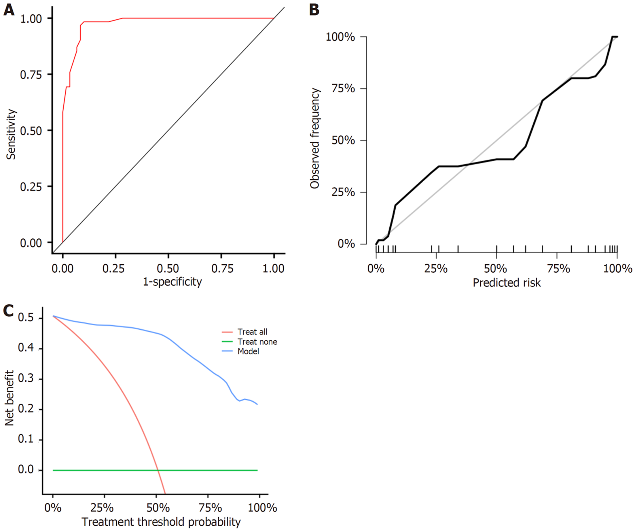 绘制ROC曲线显示, 肝异型增生结节恶性转化风险列线图的AUC为0.978(95%CI: 0.957-0.998), 且预测结果曲线与理想结果曲线高度贴合, 在较宽的阈值概率范围内, 采用所绘制的肝异型增生结节恶性转化的列线图对结局事件进行预测能获得临床净获益. 见图2.