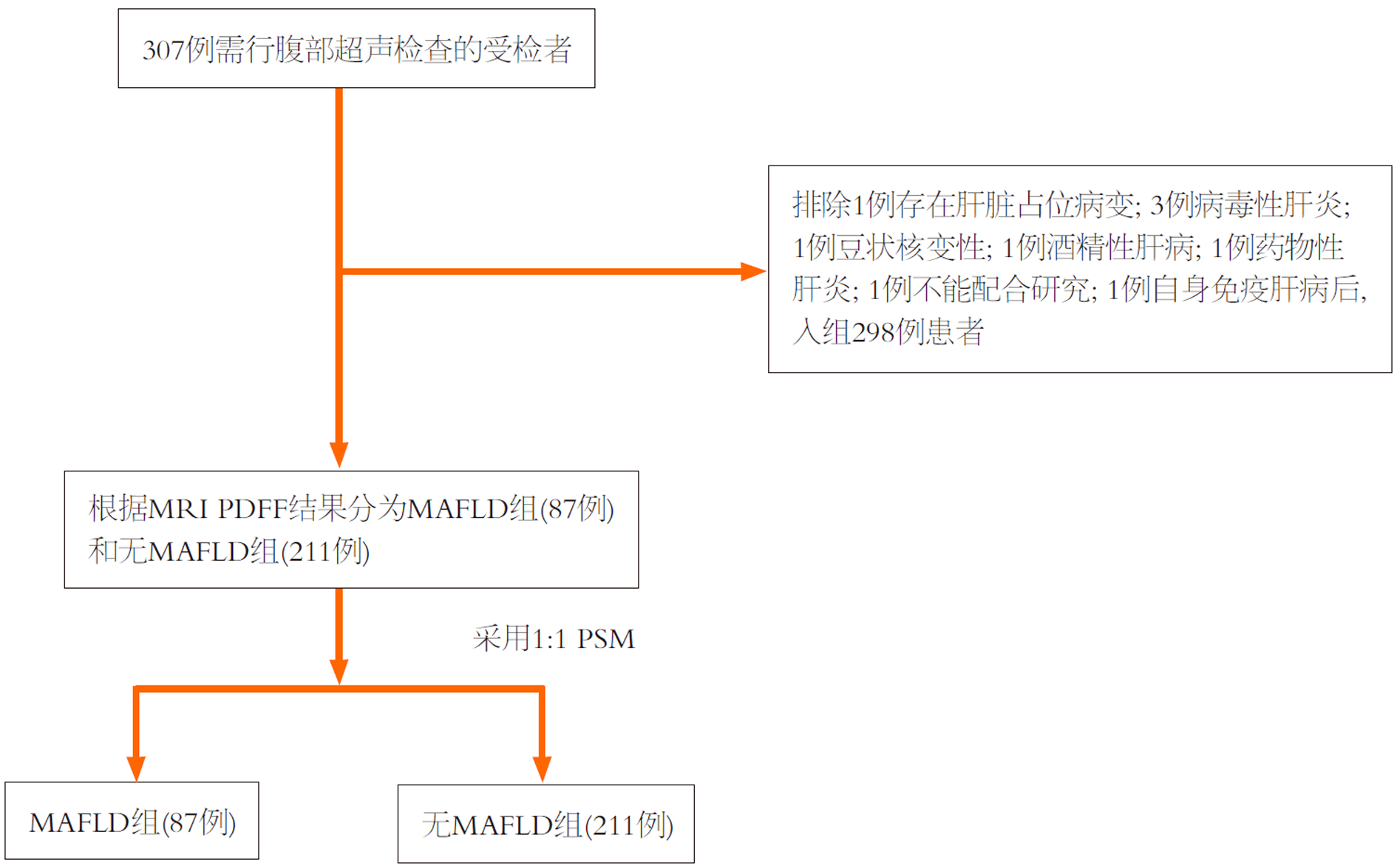 选取金华市中医医院2023-02/2025-03收治的298例需行腹部超声检查的受检者开展前瞻性研究. (1)纳入标准: ①因病情需要, 行腹部超声检查和MRI PDFF检查; ②>18岁; ③无相关检查禁忌症. (2)排除标准: ①存在肝脏占位病变; ②病毒性肝炎; ③豆状核变性; ④酒精性肝病; ⑤药物性肝炎; ⑥不能配合研究; ⑦自身免疫肝病. 本研究获得金华市中医医院伦理委员会批准, 批号: 金华市中医医院伦审2025研第032号-批, 患者签署知情同意书. 患者招募流程图见图1.