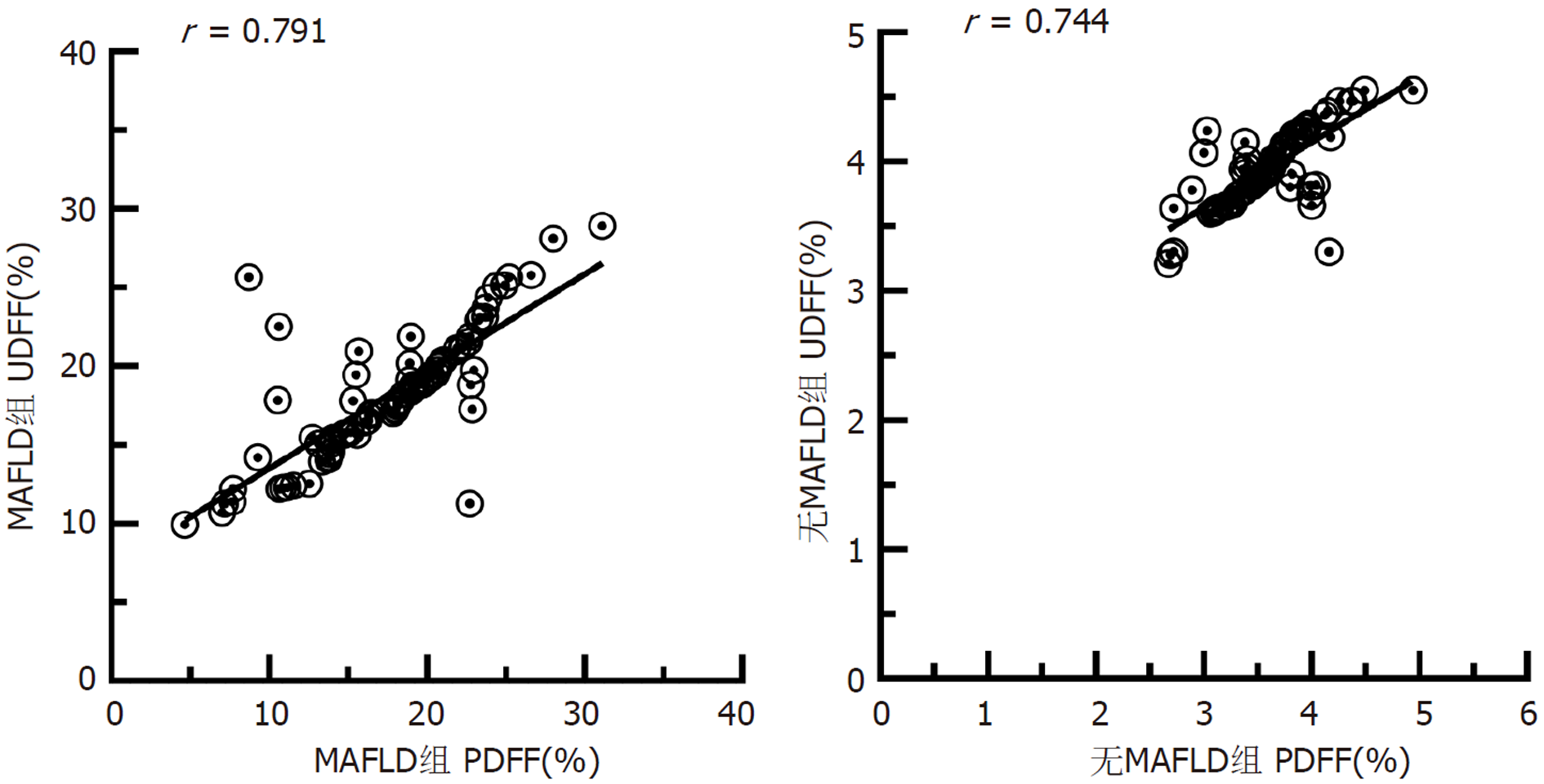UDFF系新型肝脂肪变含量测定技术, 其固定的感兴趣区及系统内置的参照模体数据能显著降低不同超声科技师及不同受检者之间的差异, 提高诊断的准确性[12,13]. 本研究结果发现, MAFLD组患者UDFF、MRI PDFF显著高于无MAFLD组, 且Pearson相关性分析显示, 在MAFLD组与无MAFLD组中, UDFF均与MRI PDFF呈显著正相关, 与Qi等[14]报道一致, 提示两者变化趋势一致.