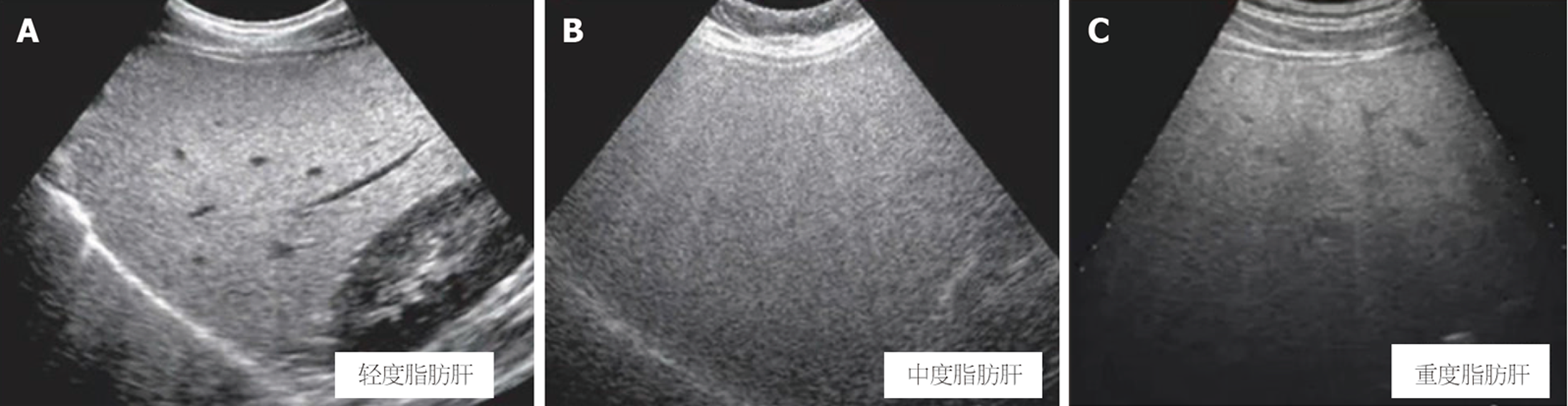 不同肝脂肪变程度患者之间比较, 轻度、中度、重度患者UDFF、MRI PDFF依次升高, 两两比较差异均有统计学意义(P<0.05). ICC分析显示, 轻度患者中: ICC = 0.723, 提示两者具有中等一致性; 中度与重度患者中, ICC均>0.850, 提示两者均具有优秀的一致性, 即UDFF在较高脂肪变时与MRI-MRI PDFF高度一致. Bland-Altman分析显示, 轻度患者中, Bias = 0.920%, 提示UDFF略高估, LOA范围较宽(-0.980至2.820), 提示低值区间一致性较低; 中度和重度患者中, Bias偏差缩小, 尤其是重度患者几乎无偏差(Bias = -0.25%), LOA变窄, 表明中高脂肪变时两种方法高度一致. 异方差性检验显示, 测量差值的绝对值与平均值间无显著相关性(r = 0.182, P = 0.092), 表明数据不存在显著的异方差性, 所报告的总体Bias与LOA在全测量范围内具有稳定性. 见表3. 不同肝脂肪变程度患者超声表现见图3.