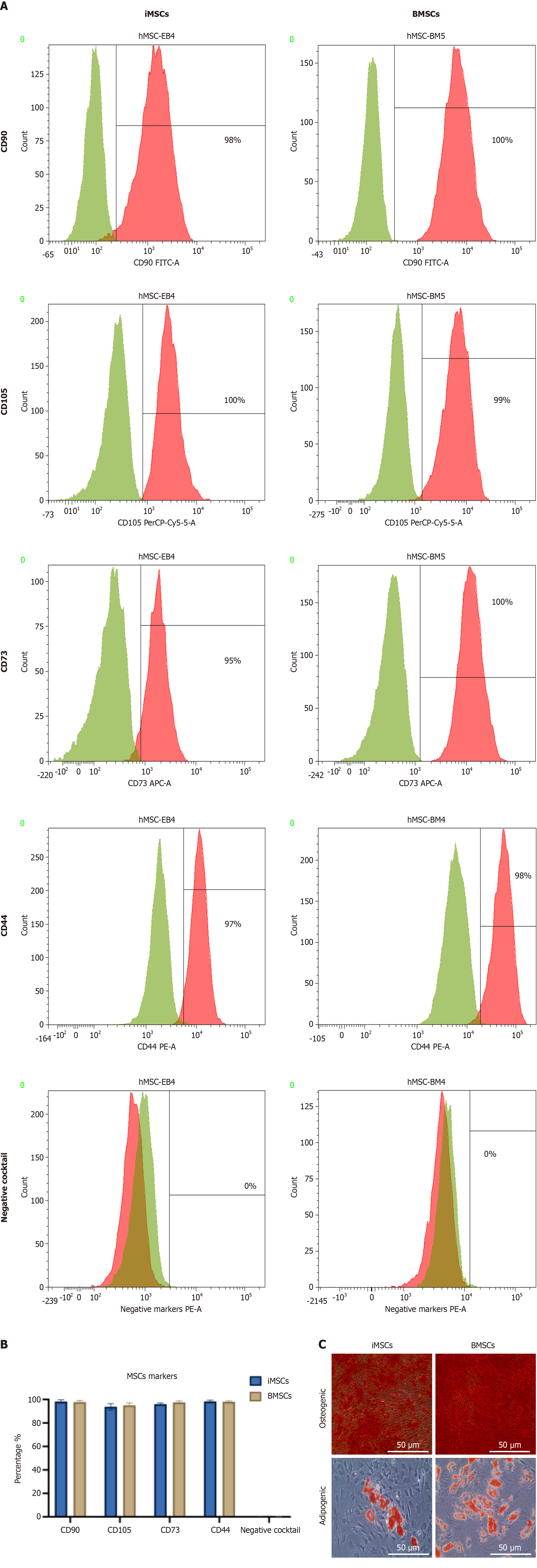 A: Flow cytometry analysis showed the expression of mesenchymal stem cell (MSC) positive surface markers (CD90, CD105, CD73, CD44) and negative hematopoietic lineage markers (CD34, CD45, CD14, CD11b, CD79a, CD19, HLA-DR) in both induced pluripotent stem cell-derived MSCs (iMSCs) and bone marrow MSCs (BMSCs); B: Quantitative comparison of human MSC surface marker expression between iMSCs and BMSCs; C: Osteogenic and adipogenic differentiation of iMSCs and BMSCs demonstrated by Alizarin Red staining (top panels) indicating calcium deposits and Oil Red O staining (bottom panels) showing lipid droplet formation. Images of differentiated iMSC-derived cells are displayed in the lower left panels while those of BMSC-derived cells appear in the lower right panels (scale bar = 50 μm). iMSCs: Induced pluripotent stem cell-derived mesenchymal stem cells; BMSCs: Bone marrow mesenchymal stem cell; MSCs: Mesenchymal stem cells.