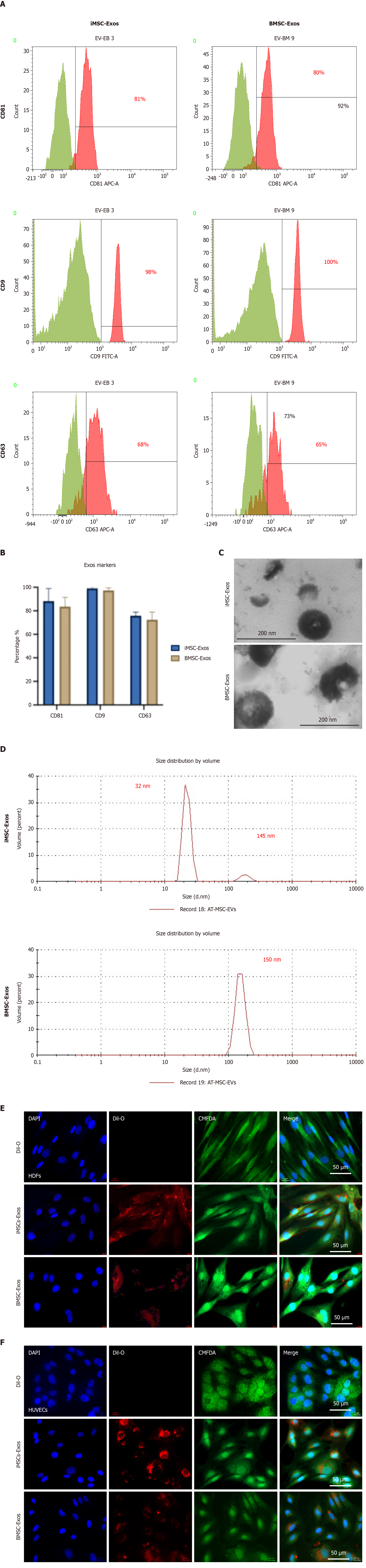 A: Flow cytometry analysis showing expression of tetraspanin surface markers CD9, CD81, and CD63 on exosomes using sulfate-latex bead capture; B: Quantification of surface marker expression comparing exosomes derived from induced pluripotent stem cell-derived mesenchymal stem cells (iMSC-Exos) and exosomes derived from bone marrow mesenchymal stem cells (BMSC-Exos); C: Representative transmission electron microscopy images of iMSC-Exos (left) and BMSC-Exos (right). Scale bar = 200 nm; D: Dynamic light scattering profiles depicting size distribution of iMSC-Exos (top) and BMSC-Exos (bottom); E and F: Confocal microscopy images showing uptake of DiI-labeled exosomes (red) by human dermal fibroblasts (E) and human umbilical vein endothelial cells (F). Cells were costained with 5-chloromethylfluorescein diacetate (green) for the cytoplasm and DAPI (blue) for the nuclei. Scale bar = 50 μm. iMSC-Exos: Exosomes derived from induced pluripotent stem cell-derived mesenchymal stem cells; BMSC-Exos: Exosomes derived from bone marrow mesenchymal stem cell; Exos: Exosomes; HDFs: Human dermal fibroblasts; HUVECs: Human umbilical vein endothelial cells.